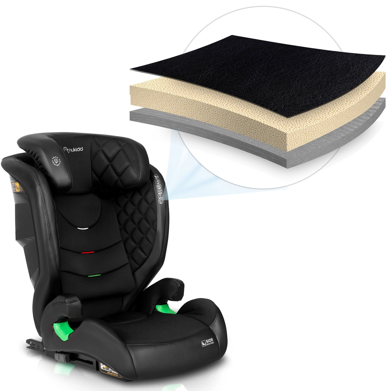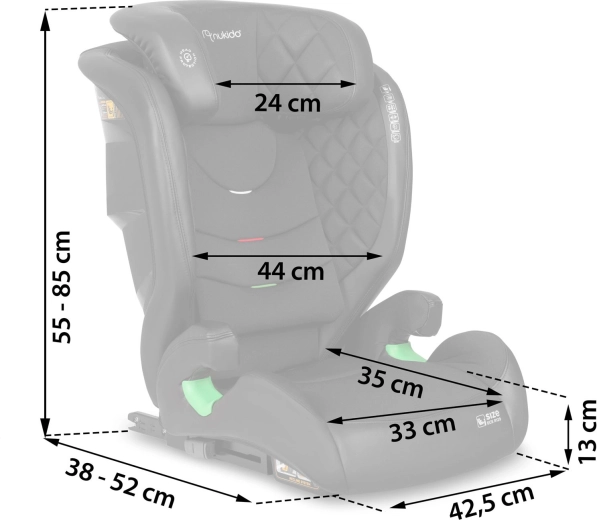 Fotelik Nukido Louis łączy premium bezpieczeństwo, wygodę oraz łatwy montaż ISOFIX dla dzieci o wzroście 100–150 cm (ok. 4–12 lat). Wyposażony jest w boczną ochronę SIP, 12-stopniową regulację zagłówka, 2 pozycje odchylenia oraz łatwo zdejmowany pokrowiec nadający się do prania. Spełnia rygorystyczną normę ECE R129 / i-Size i może być używany także jako samodzielna podstawka dla starszych dzieci.