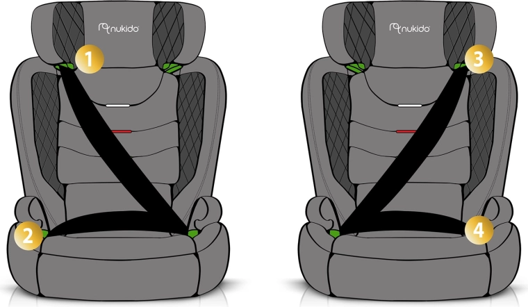 - ISOFIX + 3‑punktowy pas bezpieczeństwa pojazdu