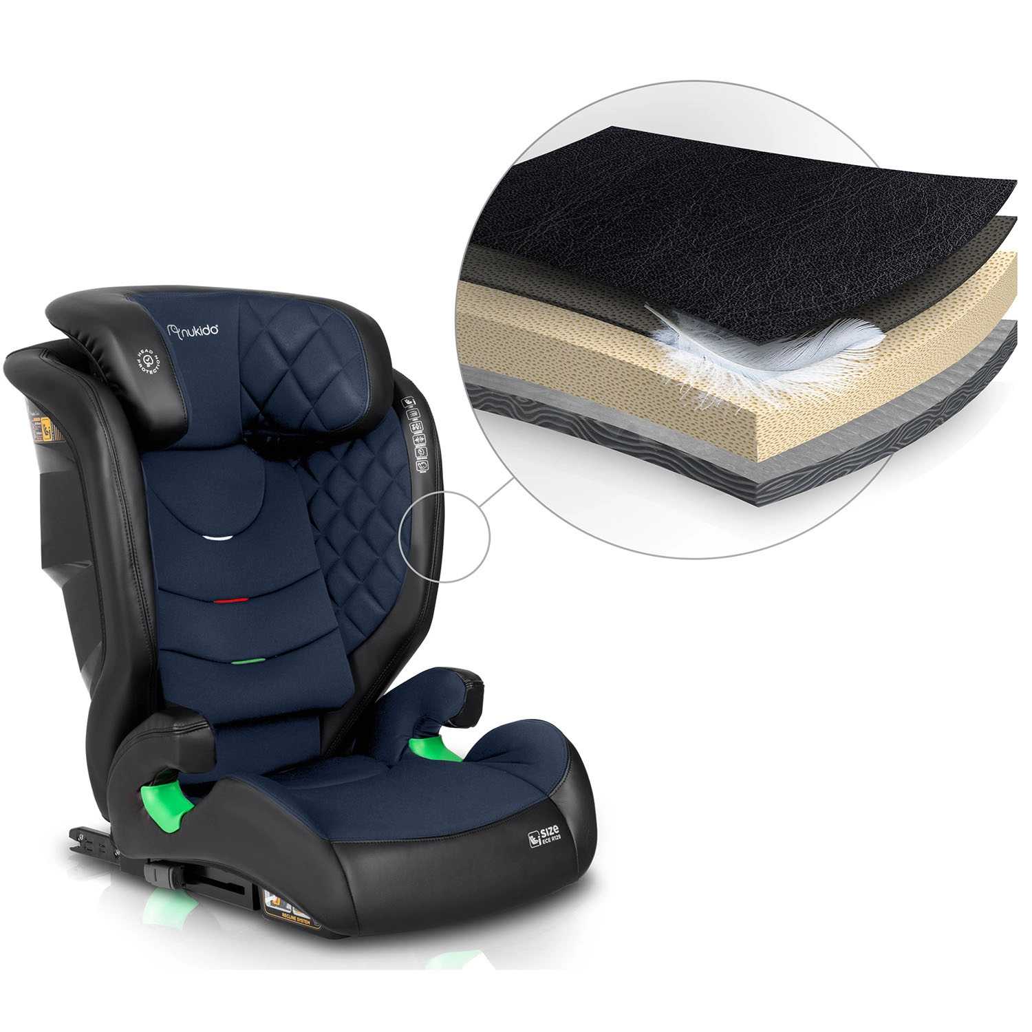Profilowana warstwa bezpieczeństwa, miękka, ekstra gruba pianka i wysokiej jakości pokrowiec zapewniają wygodę także w długiej podróży. Pokrowiec można łatwo zdjąć i wyprać.