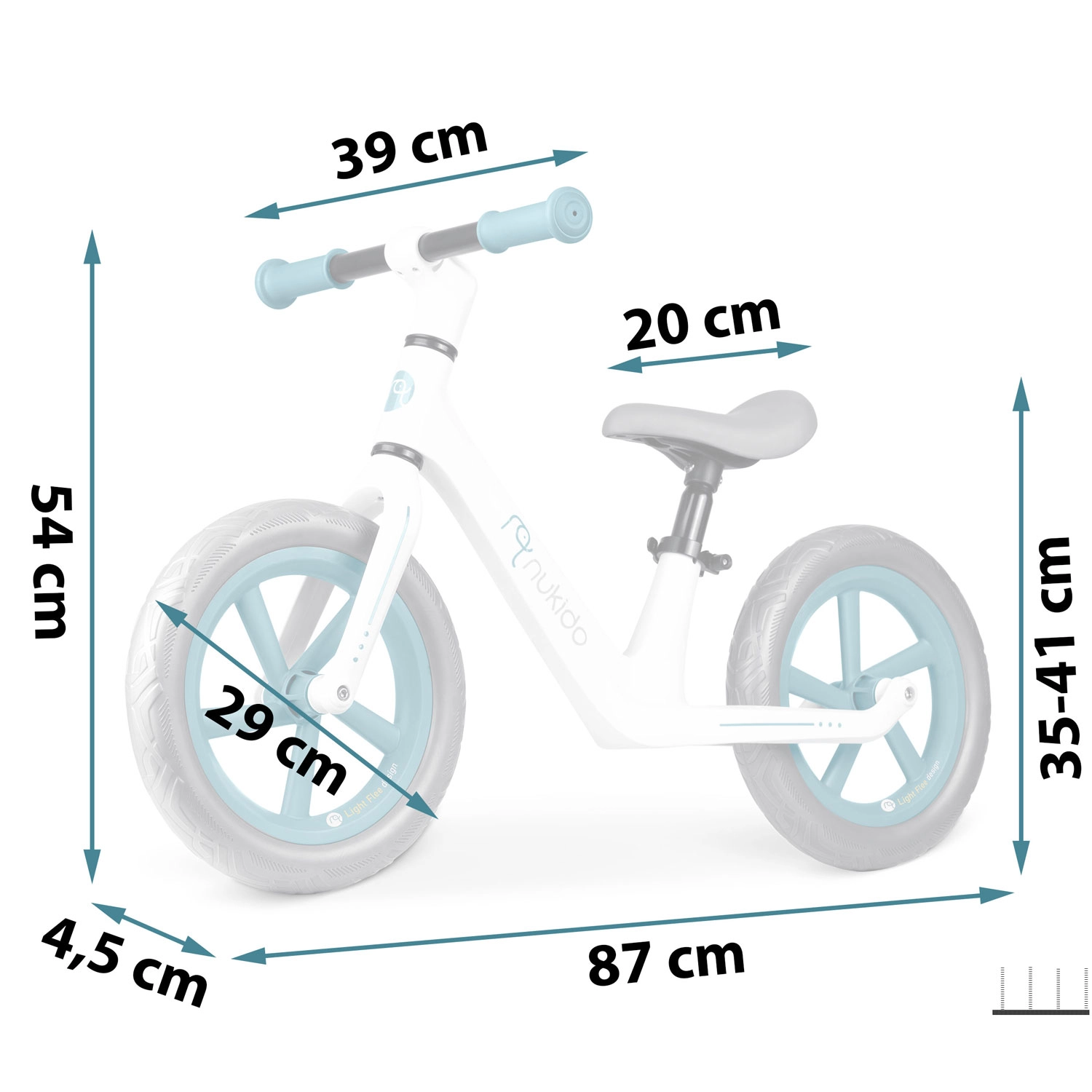 - Regulowane siodełko (35–41 cm) – idealne dopasowanie do wzrostu dziecka.