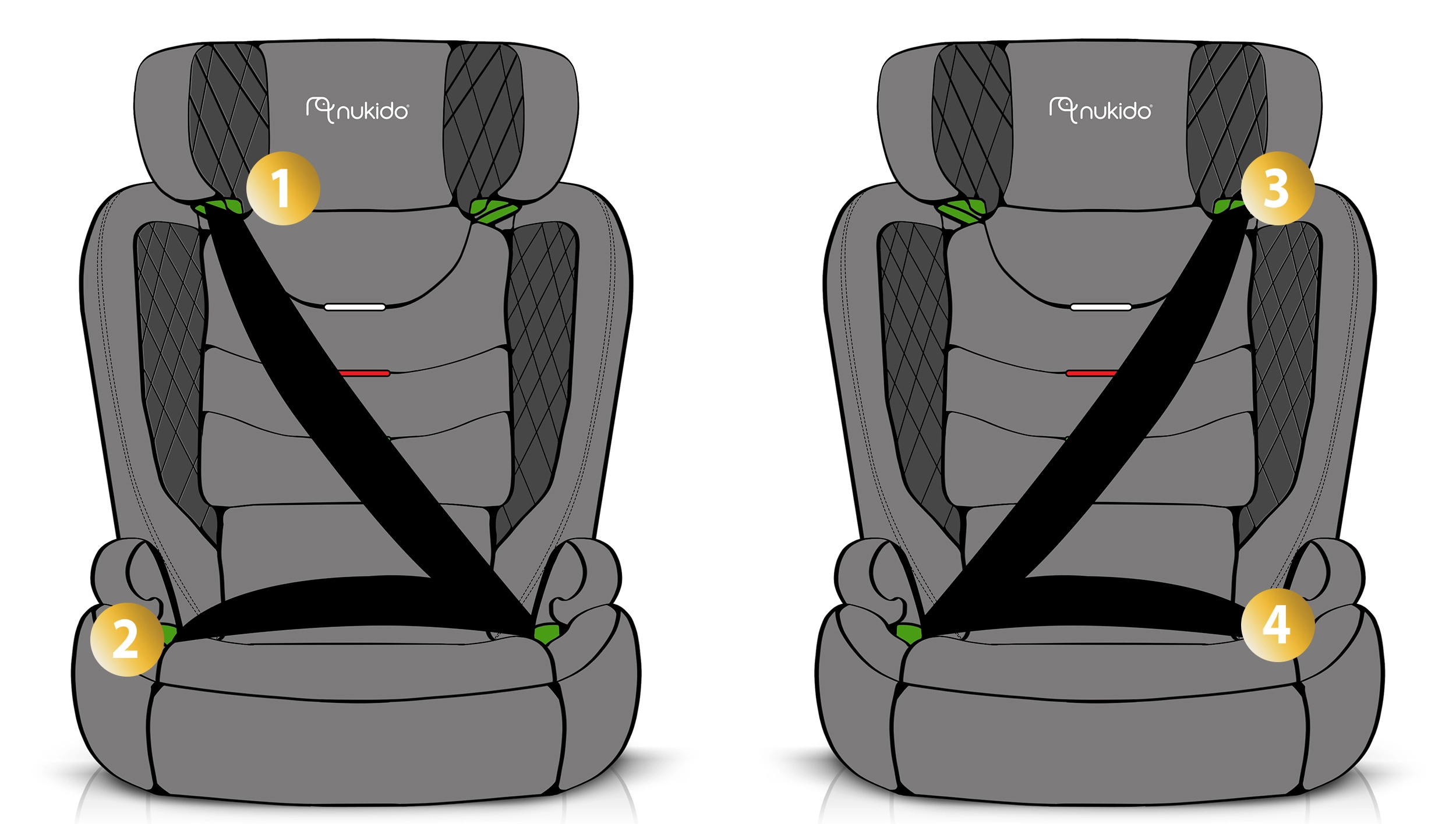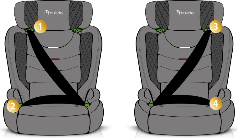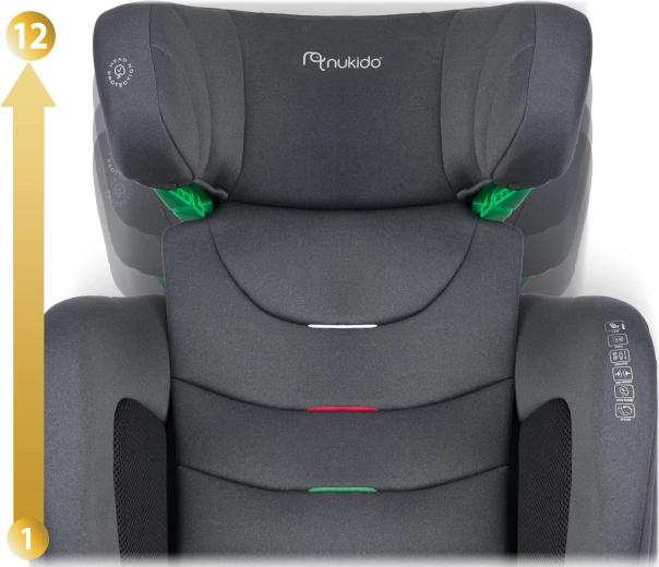Płynna regulacja wysokości zagłówka w 12 krokach dla idealnego prowadzenia pasa i komfortu od ok. 4 do 12 lat.