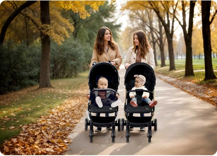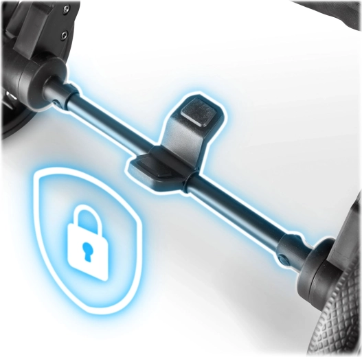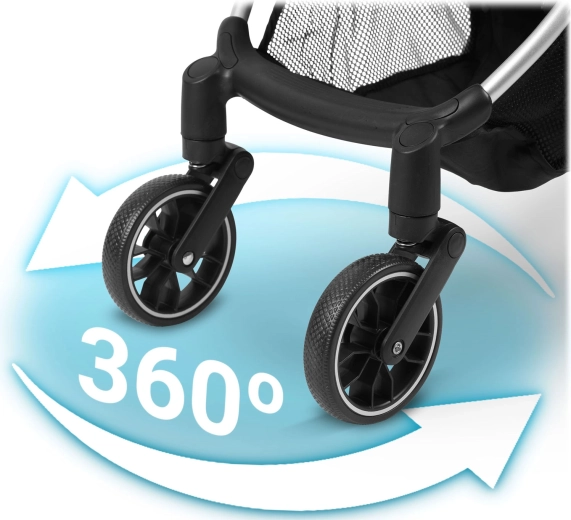 Przednie koła obracane o 360° z amortyzacją dla łatwego manewrowania w ciasnych przestrzeniach, duże tylne koła dla stabilności w terenie oraz niezawodny hamulec. Pięciopunktowe pasy z miękkimi osłonkami utrzymują dziecko w bezpiecznej pozycji.