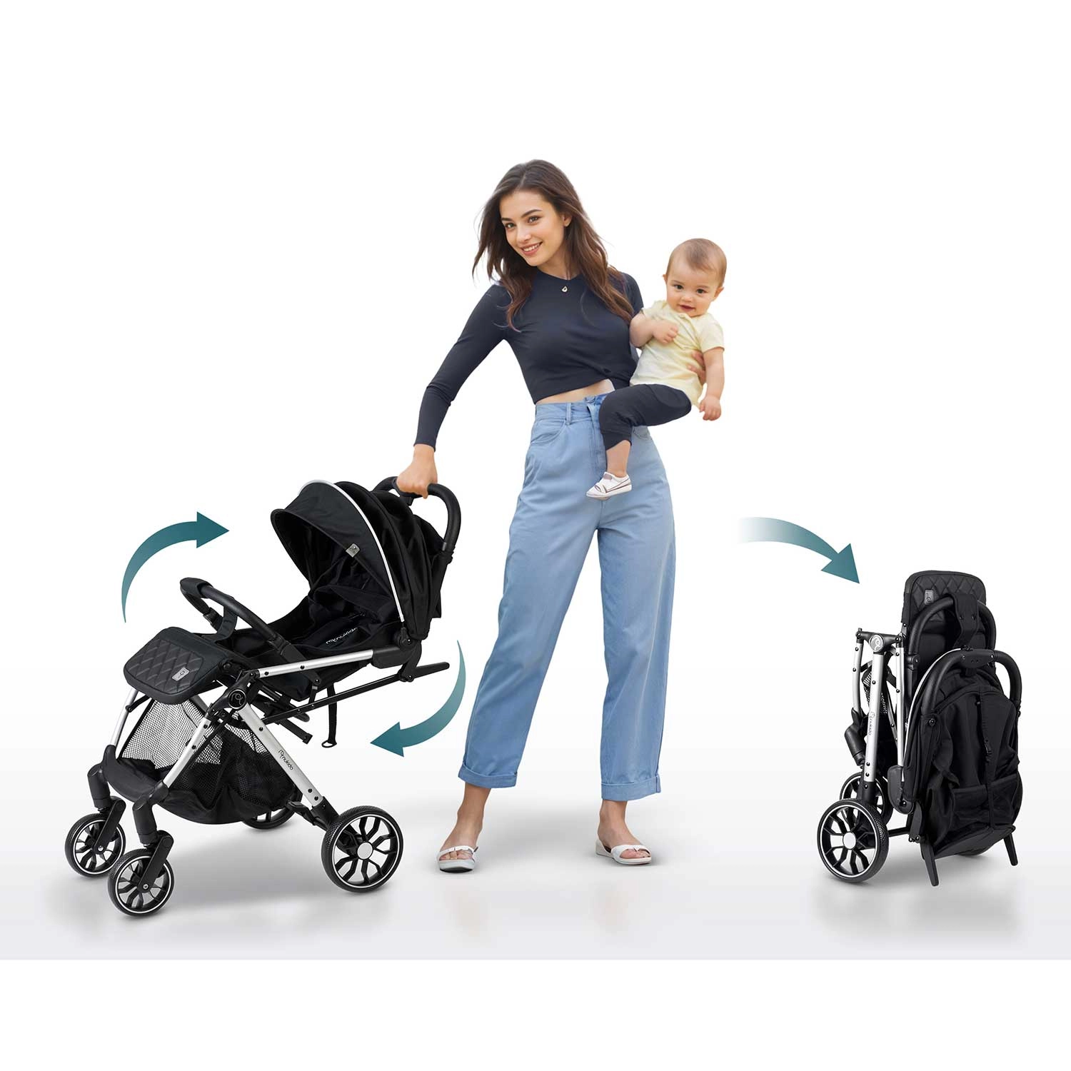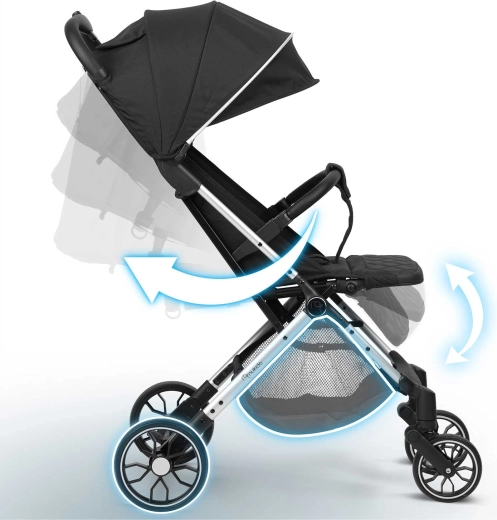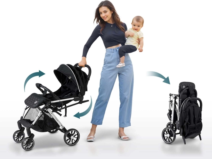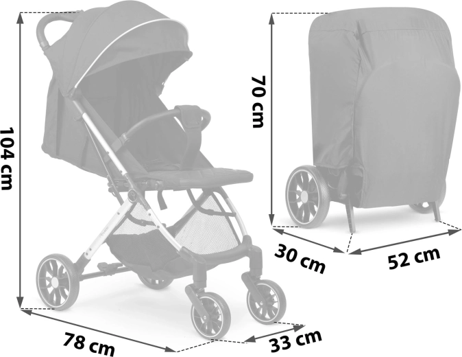 Intuicyjny przycisk pozwala złożyć wózek jedną ręką w mgnieniu oka. Kompaktowe wymiary po złożeniu mieszczą się w bagażniku samochodu, a nawet jako bagaż podręczny do samolotu. Praktyczny pokrowiec transportowy i uchwyt do ciągnięcia ułatwiają przenoszenie.