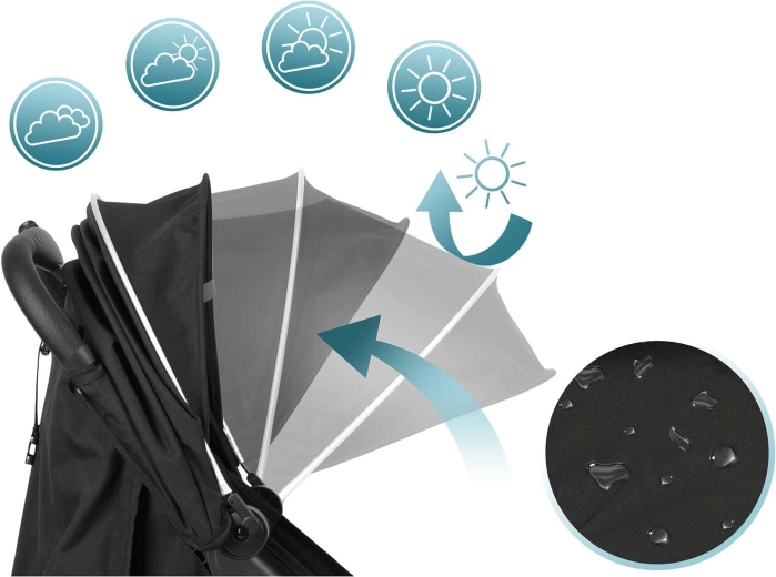Rozszerzana, wodoodporna budka chroni przed słońcem, wiatrem i lekkim deszczem. Można ją dostosować w zależności od tego, czy dziecko śpi, czy obserwuje otoczenie. W zestawie znajdziesz także folię przeciwdeszczową i ciepły śpiworek/osłonę na nóżki.