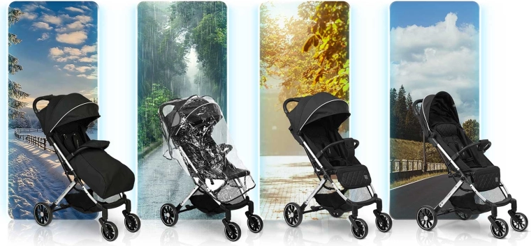 - Komfort przez cały rok: pozycja leżąca, regulowana budka z ochroną przed UV i deszczem, śpiworek/osłona na nóżki i folia przeciwdeszczowa w zestawie.