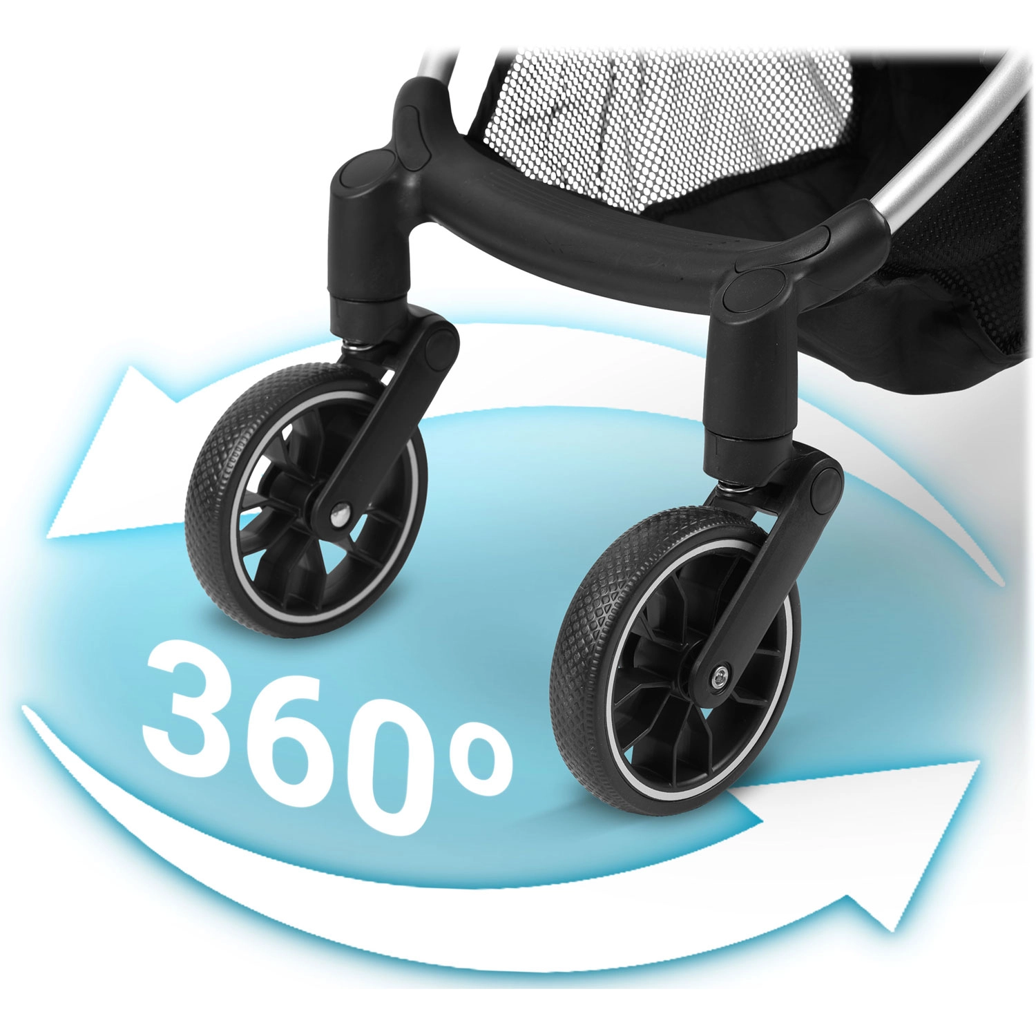 - Jazda bez wstrząsów: przednie koła 360° z amortyzacją i duże tylne koła dla stabilności.
