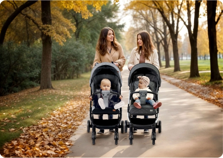Obrotowe przednie koła z niezależną amortyzacją oraz duże tylne koła radzą sobie z miejskimi nierównościami i parkowymi ścieżkami. Zyskujesz świetną zwrotność w zakrętach i komfort dla dziecka.