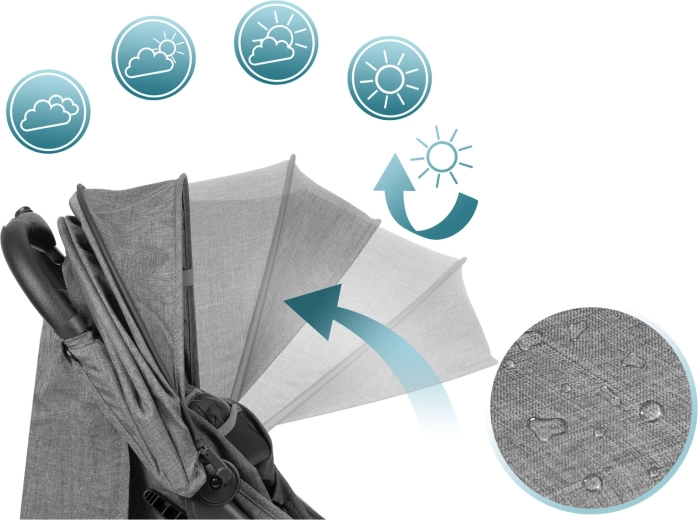 Wielopoziomowa budka chroni przed słońcem i wiatrem, a hydrofobowa tkanina opiera się mżawce. Rozsuń ją w razie potrzeby, gdy dziecko śpi, lub unieś dla lepszej widoczności.