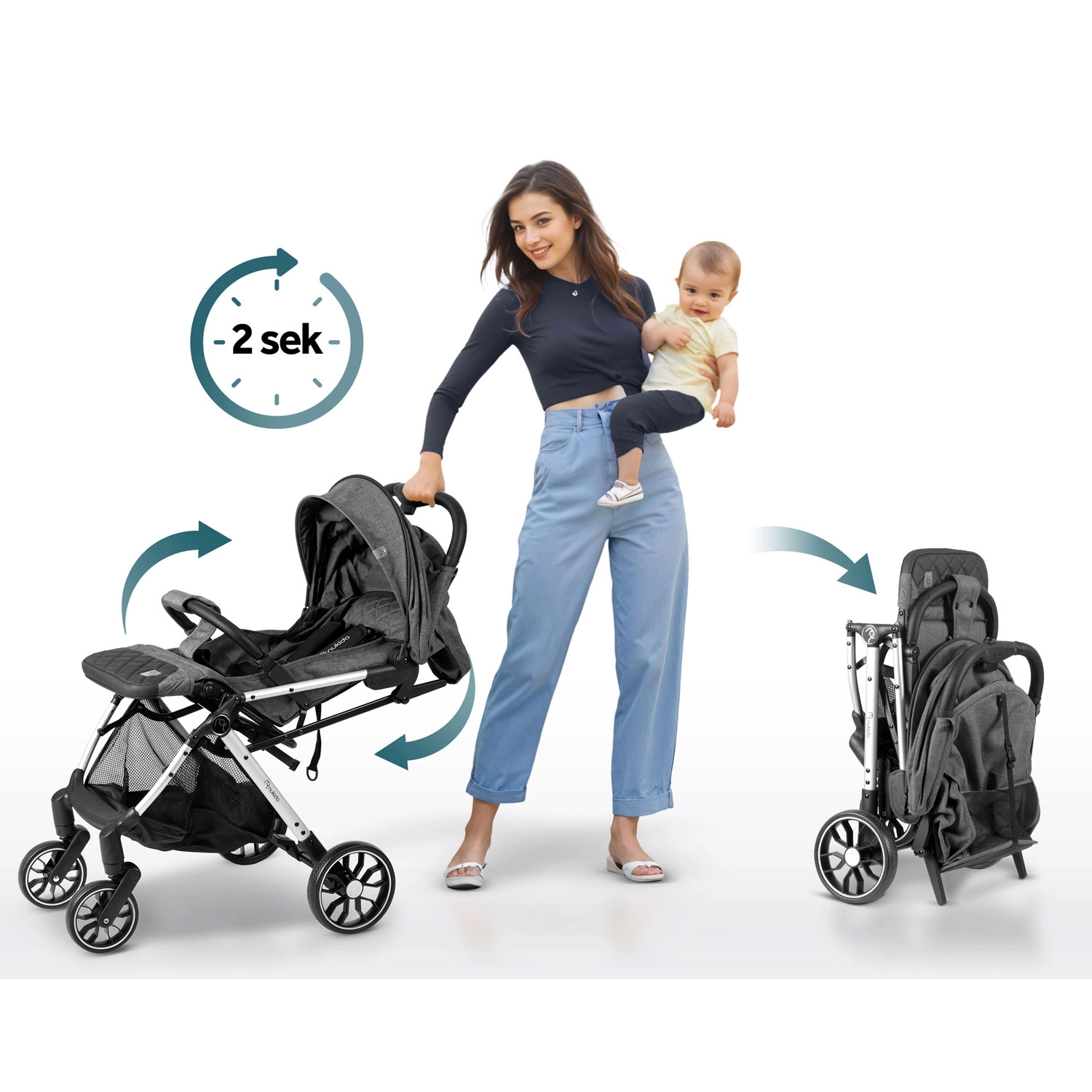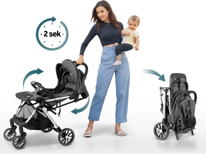 Ciesz się wygodnymi spacerami po mieście i w terenie z wózkiem spacerowym Nukido Paseo. Ten lekki i kompaktowy wózek złożysz jedną ręką w 2 sekundy do rozmiaru bagażu podręcznego. Oferuje obrotowe przednie koła 360° z amortyzacją, duże tylne koła dla stabilności, 5‑punktowe pasy bezpieczeństwa, regulowane oparcie aż do pozycji leżącej, regulowany podnóżek oraz rozszerzaną budkę z ochroną przed deszczem i UV. W zestawie znajduje się folia przeciwdeszczowa i osłonka na nóżki do użytku przez cały rok.