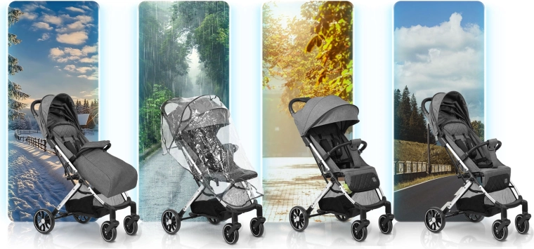 - Całoroczne użytkowanie: folia przeciwdeszczowa i osłonka na nóżki w zestawie, tkanina hydrofobowa.