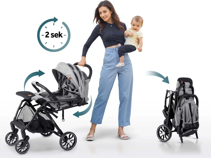 Intuicyjny przycisk umożliwia szybkie i bezpieczne złożenie wózka – idealne w komunikacji miejskiej, do auta i pod bramkę samolotu. Po złożeniu jest kompaktowy i łatwy do przenoszenia.