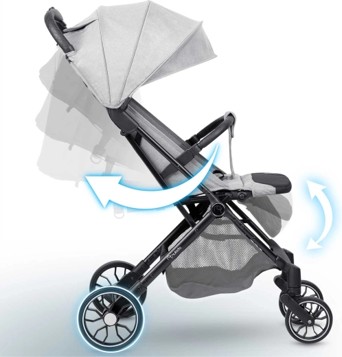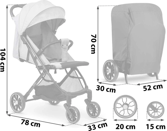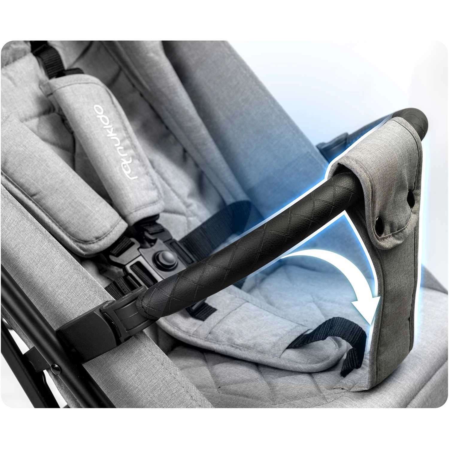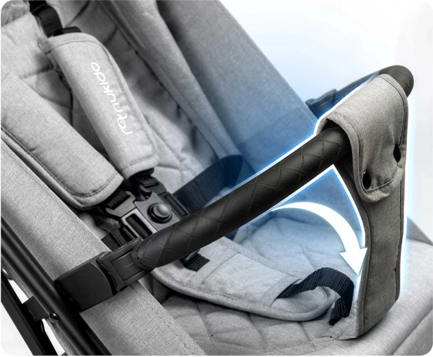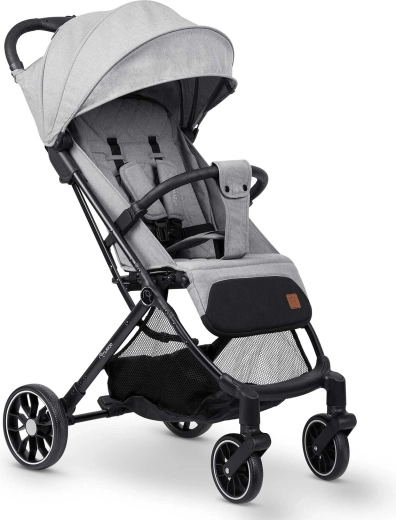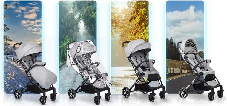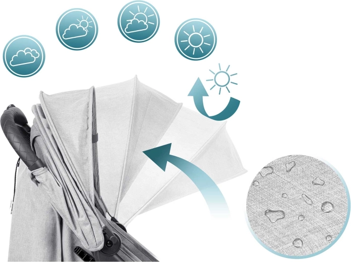 Praktyczne wyposażenie obejmuje pojemny kosz pod siedziskiem, odpinaną barierkę dla łatwego sadzania dziecka, folię przeciwdeszczową i osłonkę na nóżki w zestawie oraz bezpieczne, miękkie tkaniny przyjemne w dotyku. Duża budka z możliwością rozszerzenia chroni przed słońcem, wiatrem i lekkim deszczem i dopasowuje się do tego, czy dziecko śpi, czy obserwuje świat.
