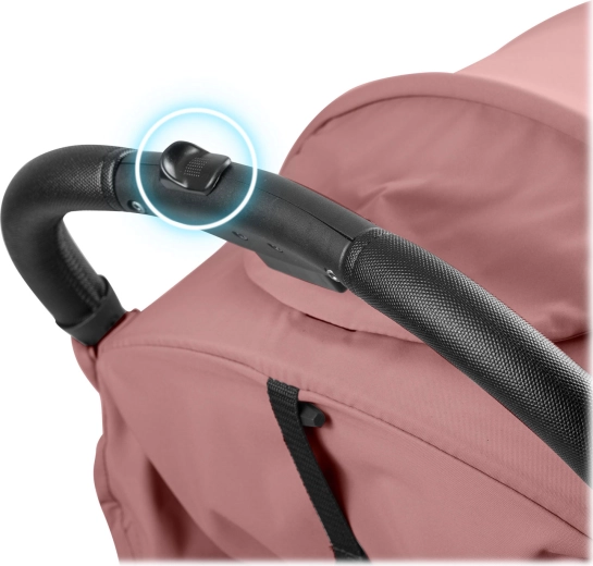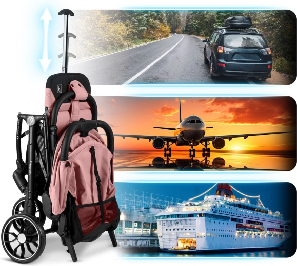 Intuicyjny przycisk umożliwia błyskawiczne złożenie jedną ręką. Po złożeniu wózek stoi samodzielnie i mieści się do rozmiaru bagażu podręcznego – idealny do auta i do samolotu.