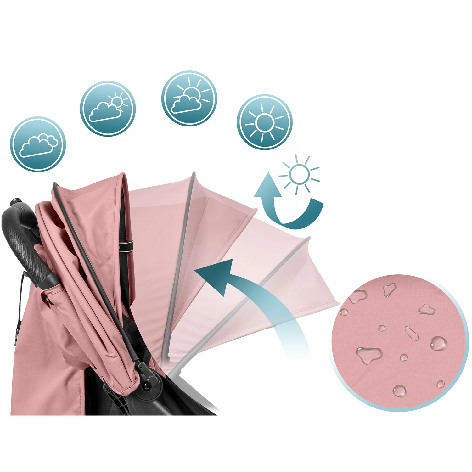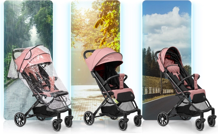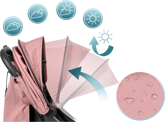 Rozszerzana budka z ochroną UV i hydrofobową powłoką chroni przed słońcem, wiatrem i lekkim deszczem. Folia przeciwdeszczowa w zestawie.