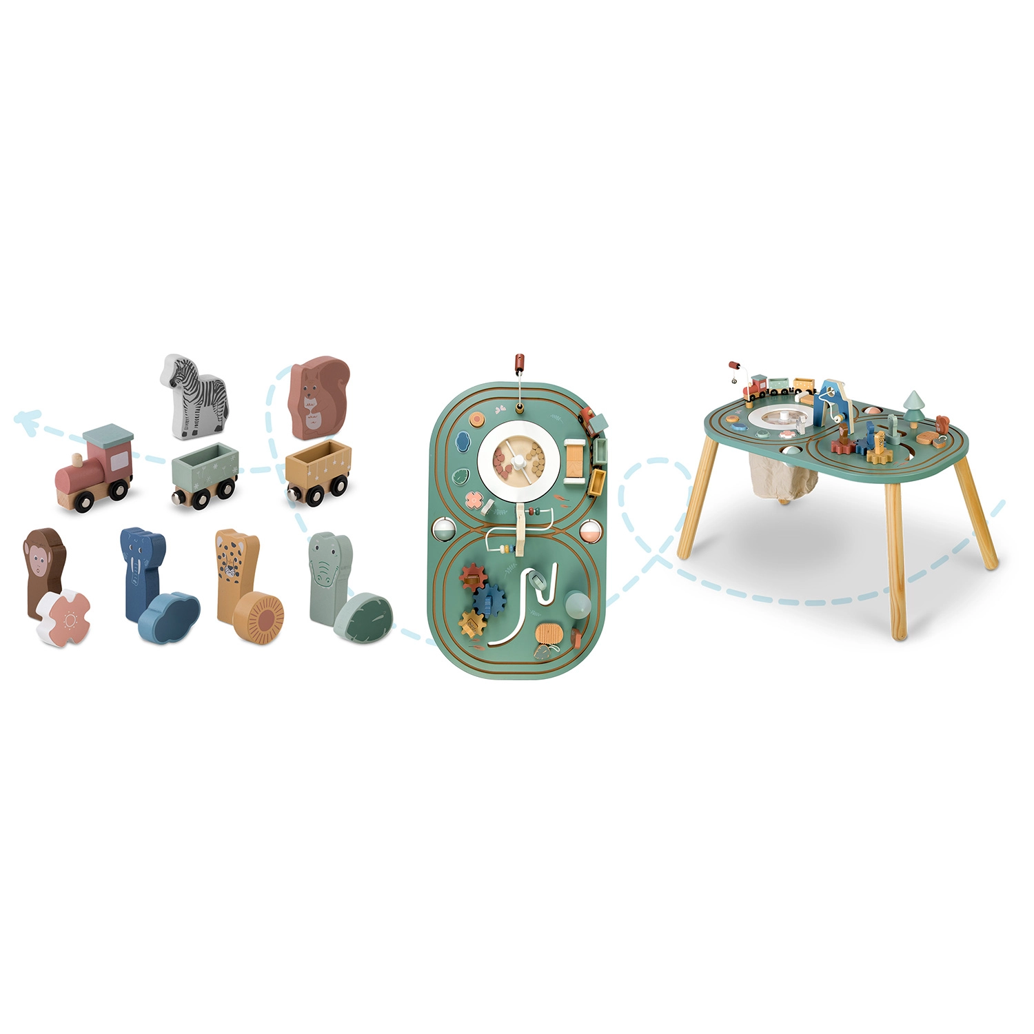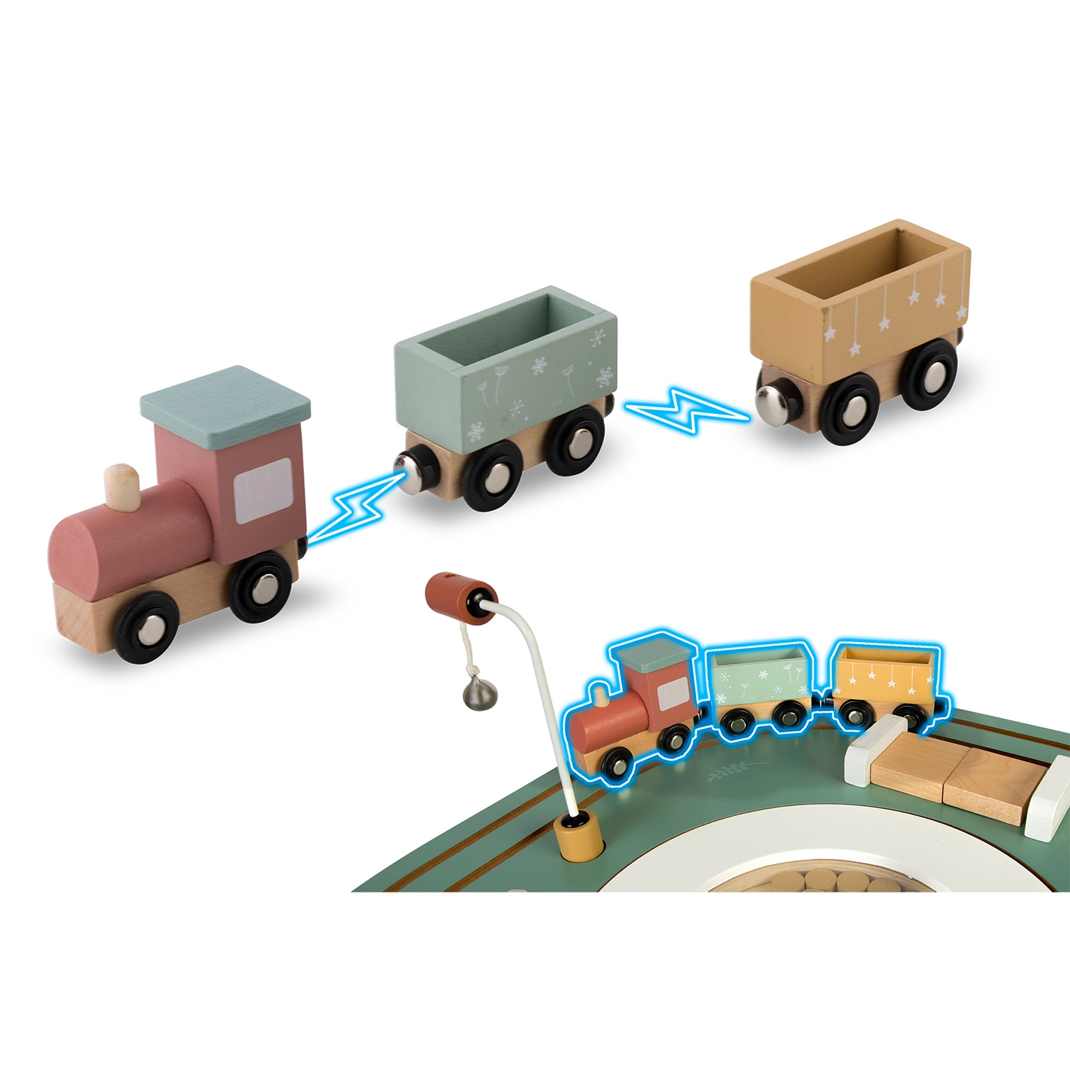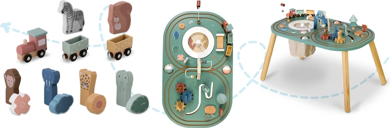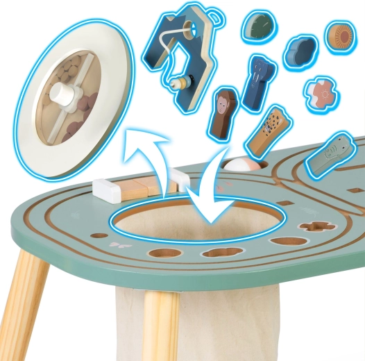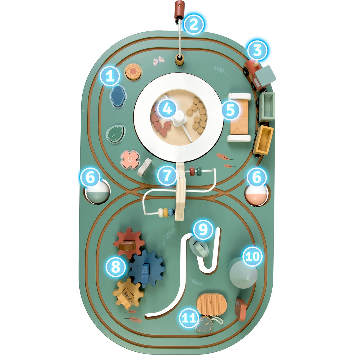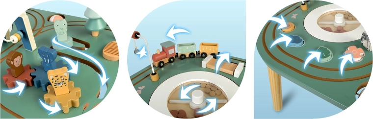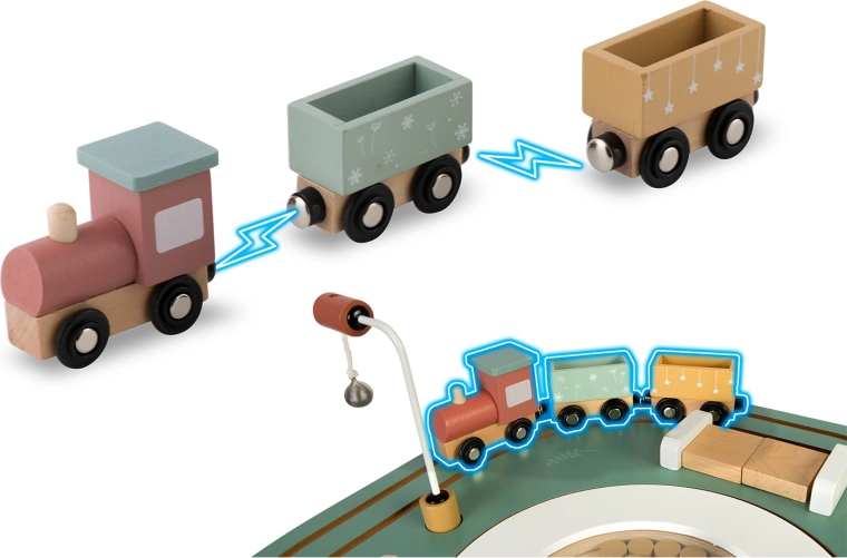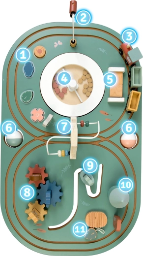 - Wielofunkcyjne centrum: kolejka na magnes, kulodrom, koła zębate, labirynty, dzwoneczek i sortujące klocki.