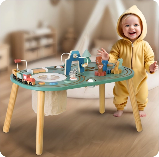 Odkryj uniwersalny drewniany stolik aktywnościowy NUKIDO z kolejką, kulodromem, labiryntami i przekładniami, który wspiera małą motorykę, percepcję sensoryczną oraz naukę przez zabawę zgodnie z zasadami Montessori. Wykonany z wysokiej jakości drewna i pomalowany bezpiecznymi farbami, oferuje długą żywotność, elegancki design oraz praktyczny tekstyliany worek do przechowywania elementów bezpośrednio pod blatem stołu.