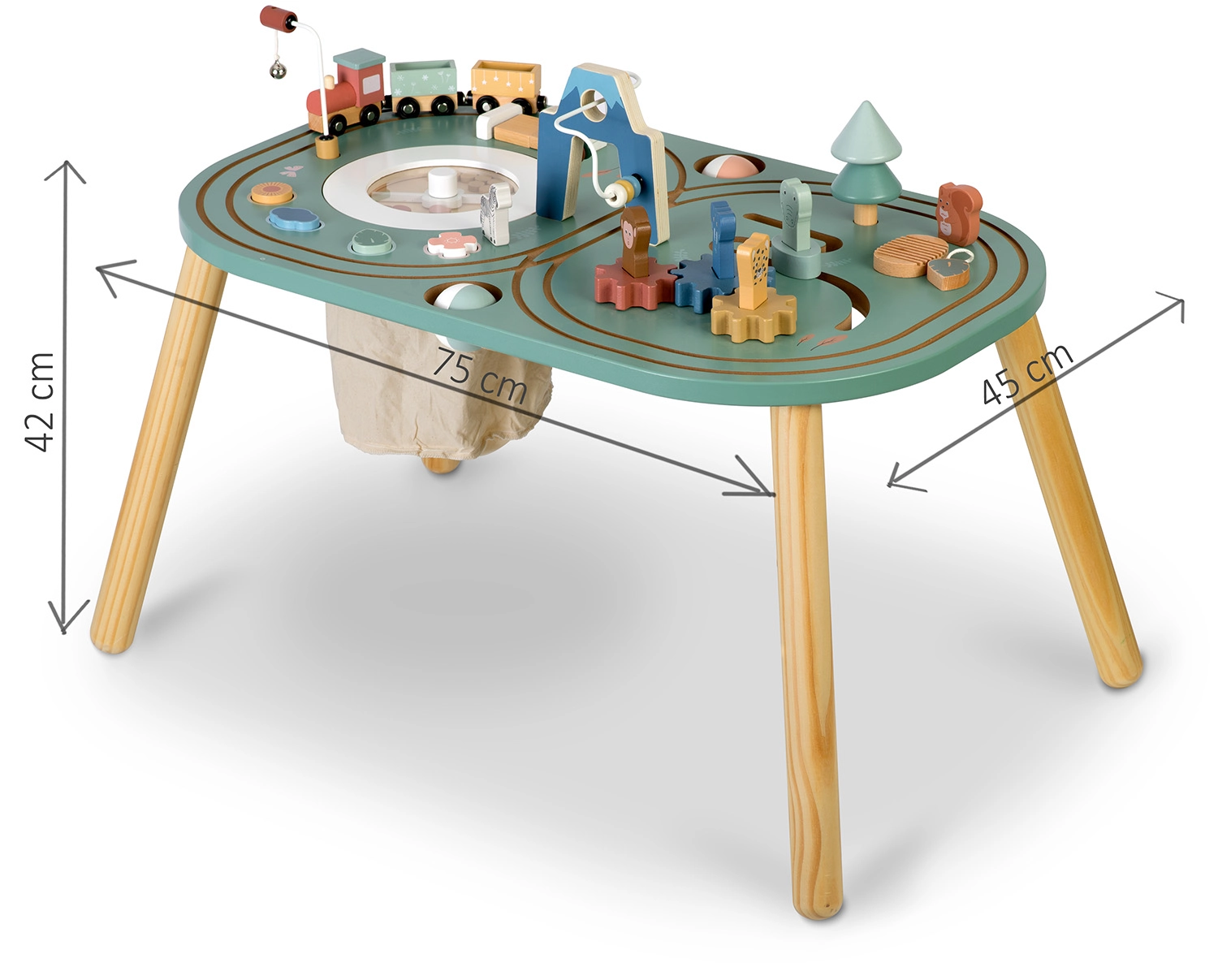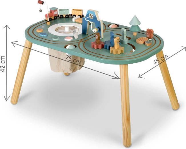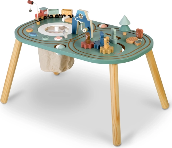 Stolik wykonany jest z naturalnego drewna o gładkich, zaokrąglonych krawędziach i wykończony bezpiecznymi, nietoksycznymi farbami. Minimalistyczny wygląd w stonowanych barwach pasuje do nowoczesnych wnętrz, a dzięki stabilnej konstrukcji wytrzymuje codzienną zabawę. Praktyczny tkany worek pod blatem pomaga utrzymać porządek – po zabawie wystarczy wszystko łatwo schować.