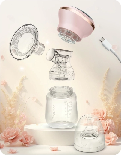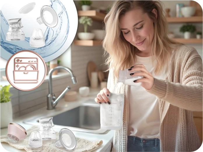 Uniwersalna miękka silikonowa wkładka masująca delikatnie dopasowuje się do kształtu piersi i wspiera przepływ mleka. W zestawie znajduje się również butelka 180 ml z dynamicznym smoczkiem, który kształtem przypomina brodawkę i nie zaburza karmienia piersią. Części (z wyjątkiem panelu elektrycznego) można myć w zmywarce, materiały są bez BPA i łatwe w utrzymaniu higienicznej czystości.