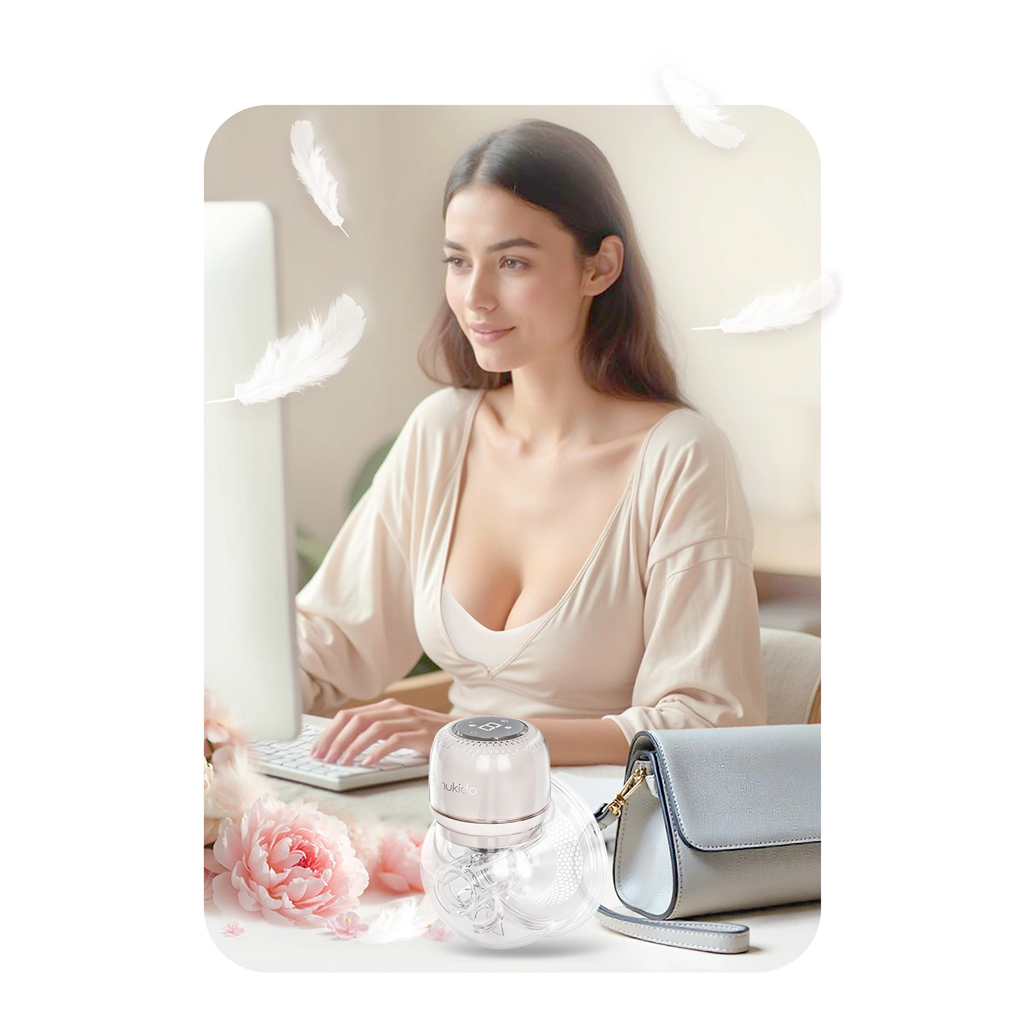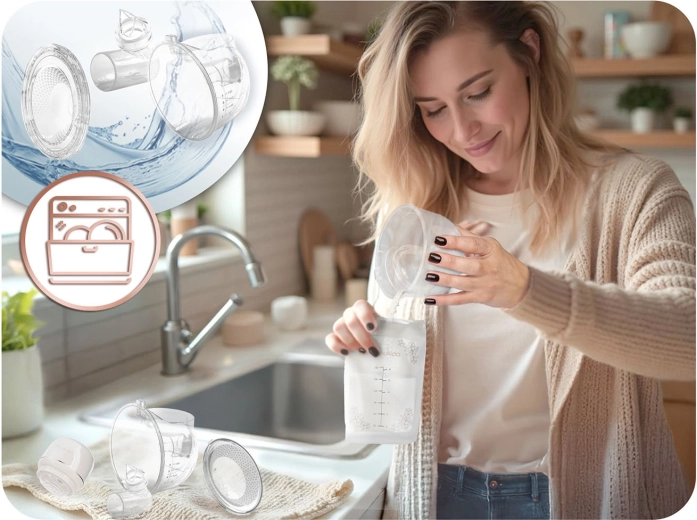 Prawdziwa swoboda ruchu – laktator jest bezprzewodowy i na jednym ładowaniu przez USB‑C działa około 3 godziny. Kompaktowy kształt umożliwia dyskretne użycie w domu, w pracy i w podróży. W zestawie znajduje się klips do regulacji ramiączka biustonosza dla wygodnego odciągania w trybie hands‑free. Wszystkie nieelektryczne części można myć w zmywarce (z wyjątkiem panelu elektronicznego), a materiały są bez BPA i o właściwościach antybakteryjnych.