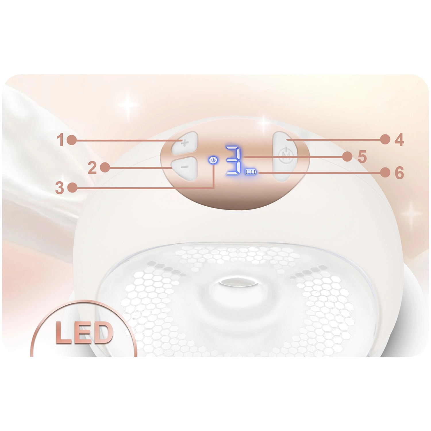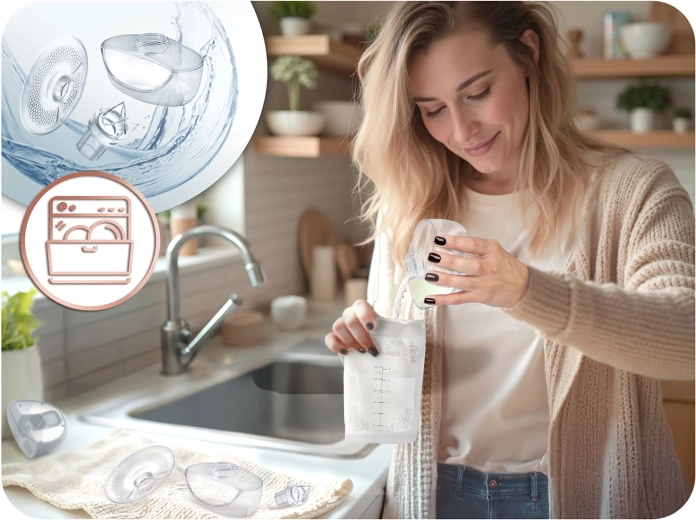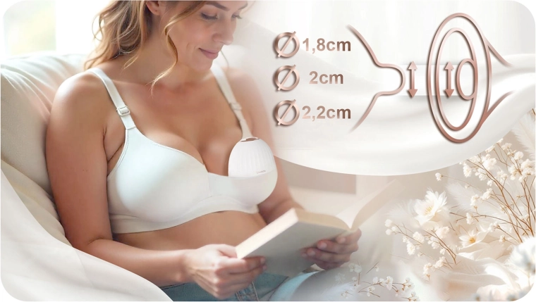 Dzięki bezprzewodowemu działaniu i ładowaniu przez USB‑C łatwo zabierzesz laktator do pracy, w podróż czy na wypoczynek. Silikonowe nakładki masujące w trzech rozmiarach delikatnie stymulują wypływ mleka i zapewniają przyjemną ulgę. Pojemnik o objętości 150 ml ma bezpieczny korek przeciw rozlaniu. Wszystkie niemotoryzowane części można myć w zmywarce, co oszczędza czas i zapewnia wysoką higienę.
