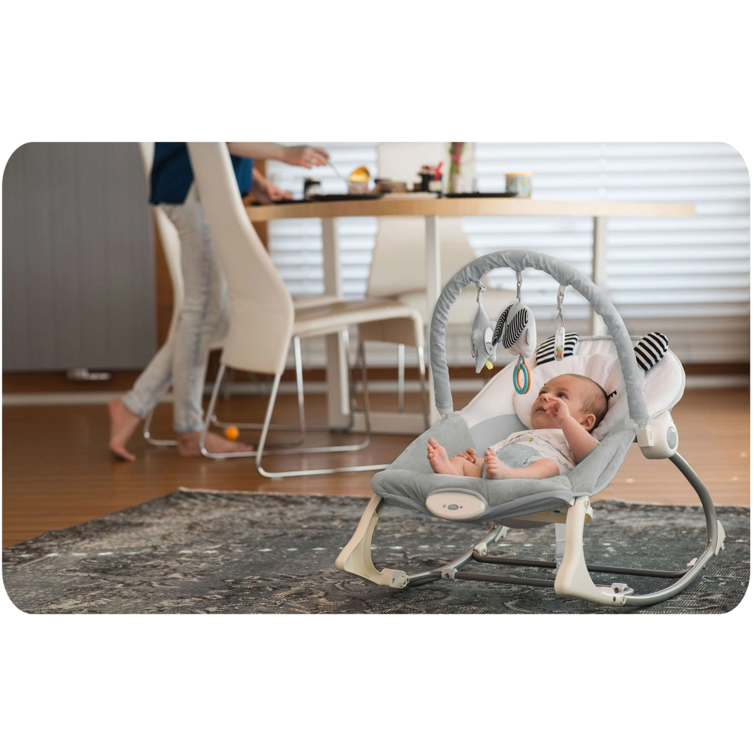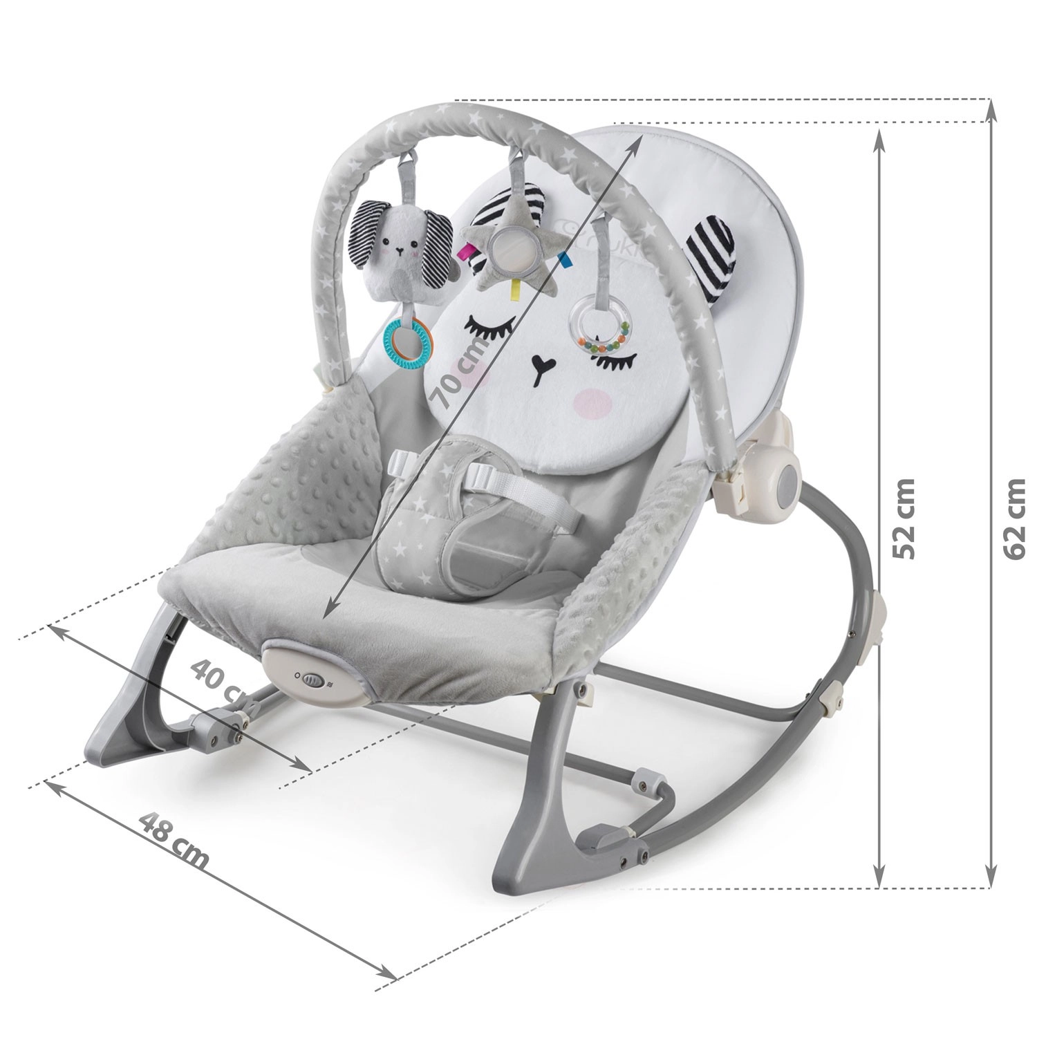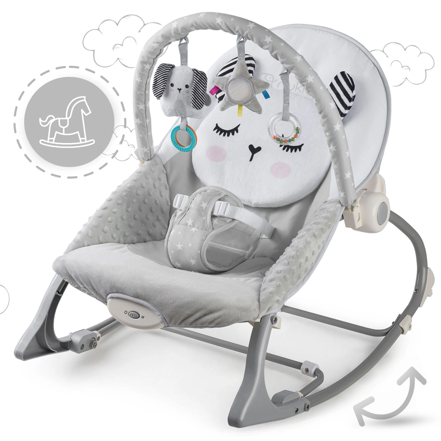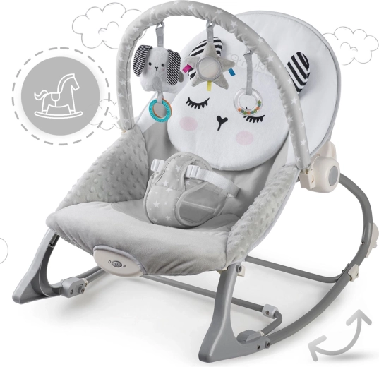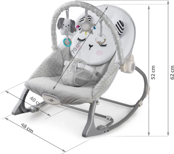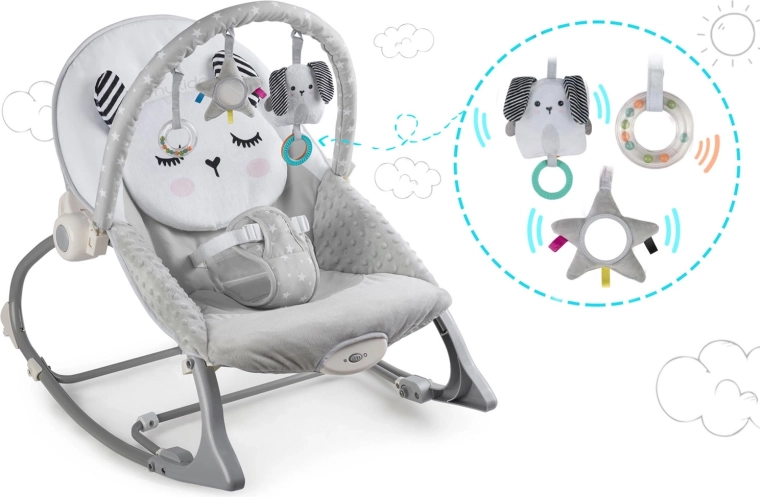 Zdejmowany pałąk z pluszowymi zabawkami i kółeczkami wspiera rozwój zmysłów, wzroku i dotyku. Zabawki można łatwo przearanżować lub wymienić na ulubione talizmany dziecka. Dwupoziomowa regulacja oparcia pozwala szybko dostosować pozycję do zabawy lub odpoczynku. Antypoślizgowe nóżki trzymają leżaczek stabilnie na miejscu, a blokada kołysania zamienia kołyskę w stałe siedzisko.