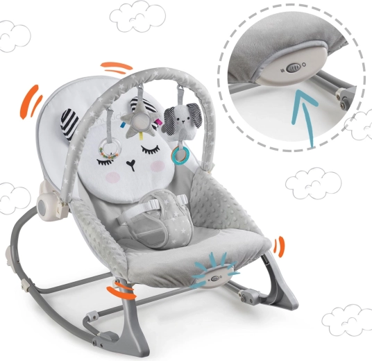 Wielofunkcyjny leżaczek dla dzieci z delikatnym kołysaniem i uspokajającymi wibracjami zapewnia maluszkowi spokój, wygodę i zabawę, a Tobie daje chwilę wolnych rąk. Ma miękkie wyściełanie, zdejmowany pałąk z zabawkami, 3‑punktowy pas bezpieczeństwa, regulowany kąt oparcia oraz antypoślizgowe nóżki. Solidna metalowa konstrukcja, możliwość blokady kołysania i łatwo zdejmowany pokrowiec dla higienicznej pielęgnacji.