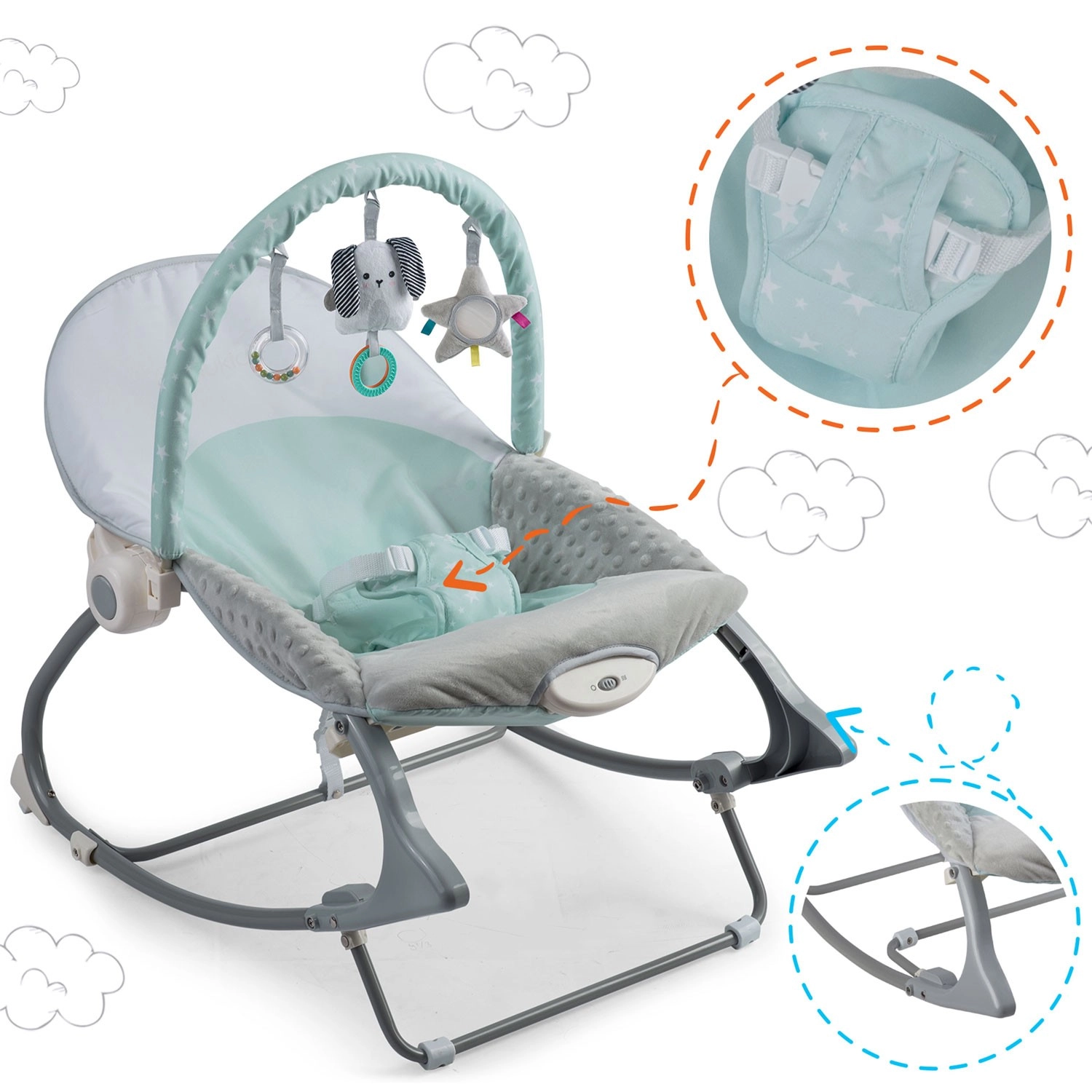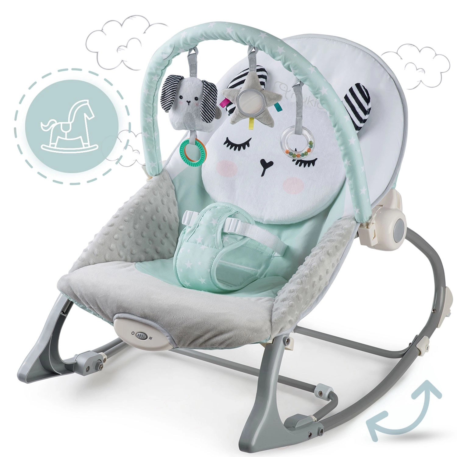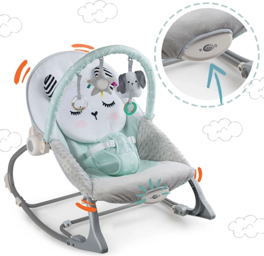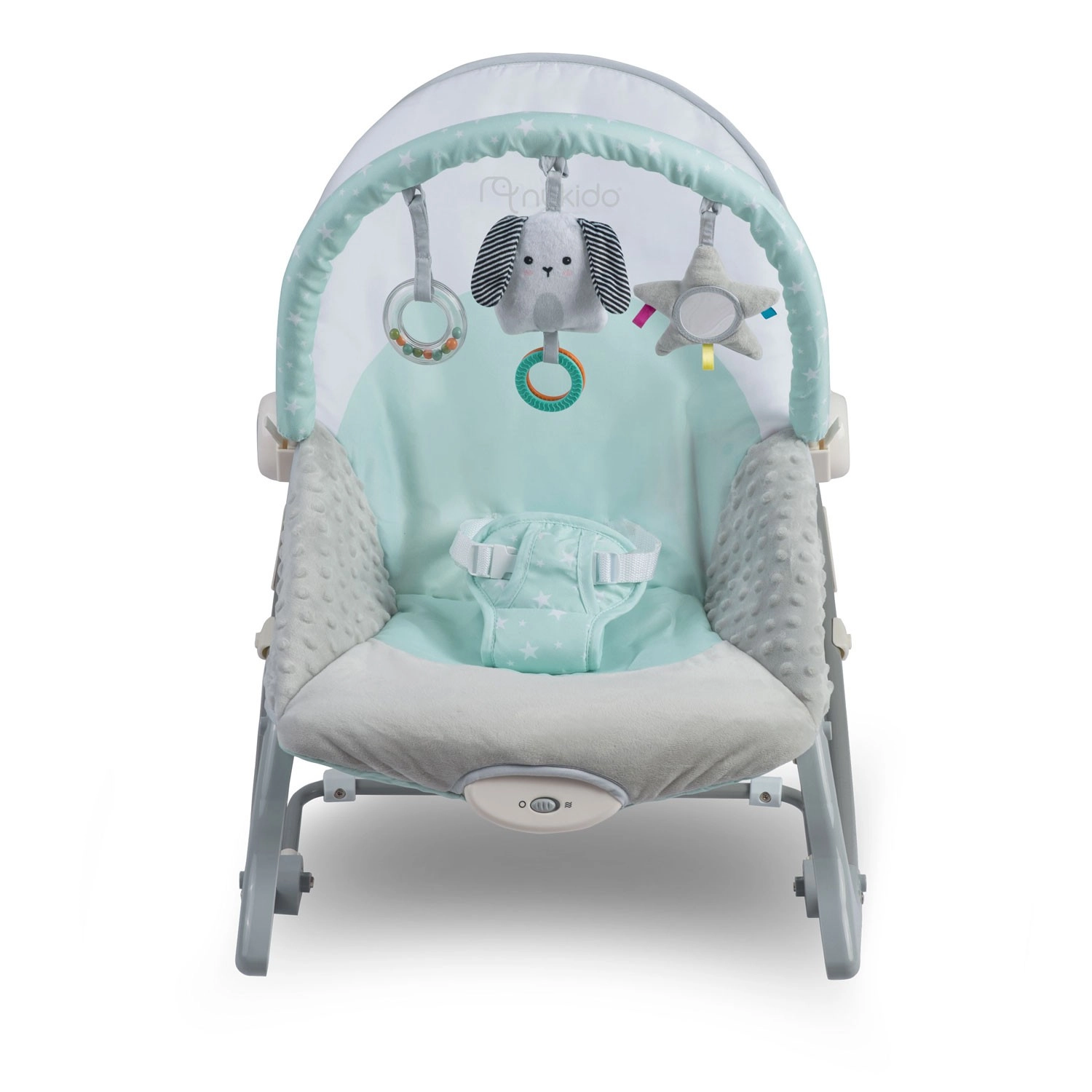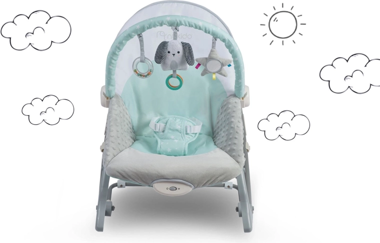 Wielofunkcyjny leżaczek dziecięcy NUKIDO w kolorze miętowym zapewnia spokój maluszkowi i wolne ręce rodzicom. Oferuje kojące wibracje, delikatne kołysanie z możliwością blokady, odpinany pałąk z zabawkami dla stymulacji zmysłów oraz miękkie, wygodne wyściełanie. O bezpieczeństwo dbają 3‑punktowe pasy i antypoślizgowe nóżki.