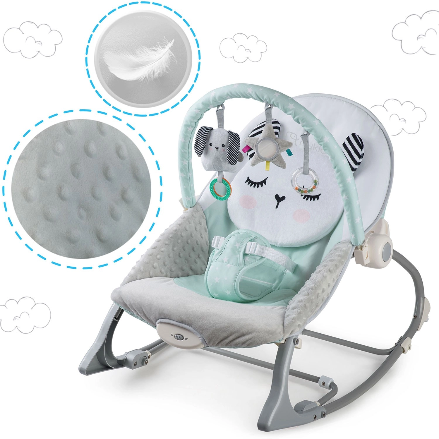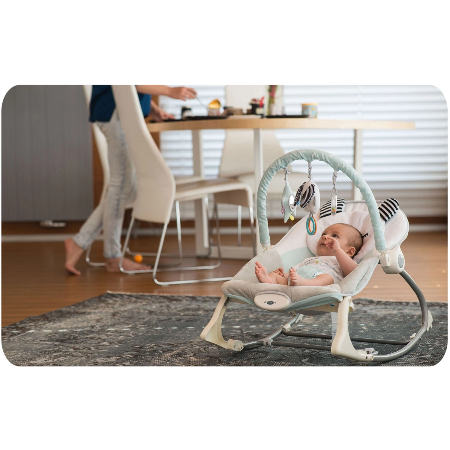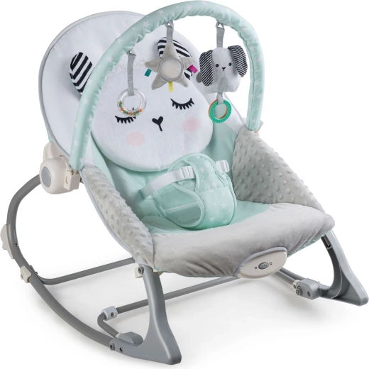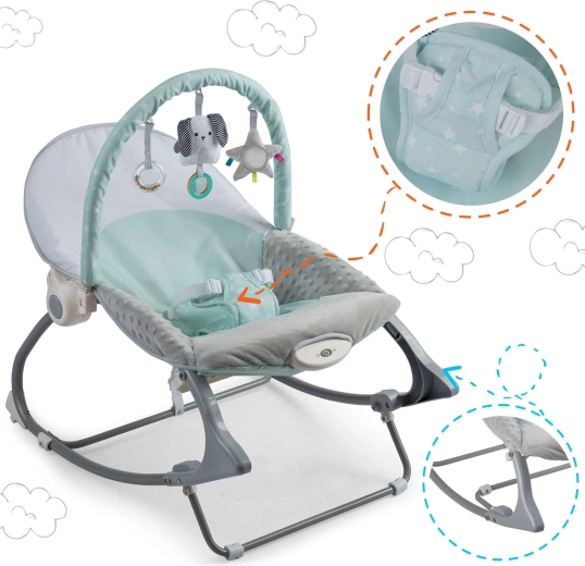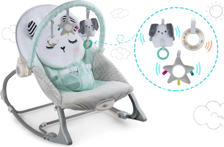Odpinany pałąk z szeleszczącymi pluszowymi zabawkami wspiera rozwój wzroku i dotyku. Miękkie, przyjemne w dotyku pokrowce zapewniają komfort, a do tego można je łatwo zdjąć i wyprać ręcznie. Stabilna konstrukcja z metalową ramą oraz możliwością zablokowania kołysania rozszerza zastosowanie leżaczka zgodnie z aktualnymi potrzebami.