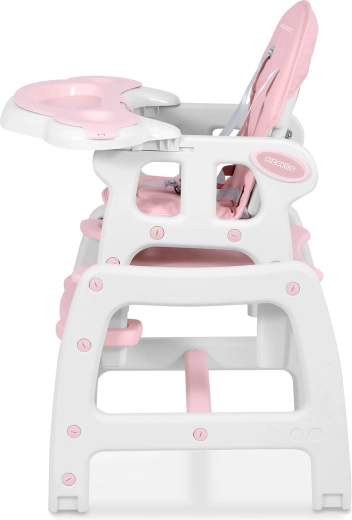 Praktyczne i stylowe dziecięce krzesełko do karmienia 5w1 RICOKIDS Sinco w kolorze różowym rośnie razem z Twoim dzieckiem od 6 do 36 miesięcy. Oferuje pięć konfiguracji do karmienia, zabawy i nauki, ma łatwą w czyszczeniu tapicerkę z eko skóry, zdejmowaną tackę oraz 5‑punktowe pasy. Dzięki kółkom z hamulcem łatwo je przestawisz, a regulowany kąt oparcia zapewni wygodę podczas posiłków i odpoczynku.