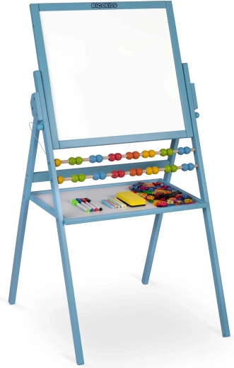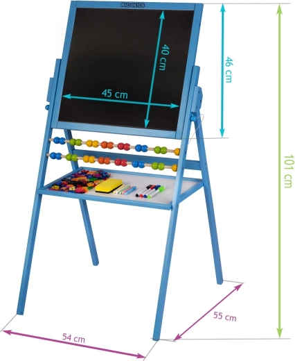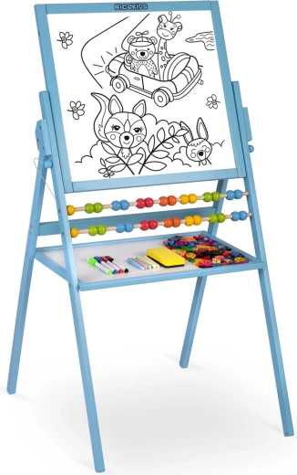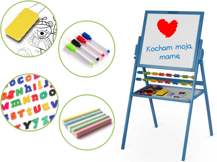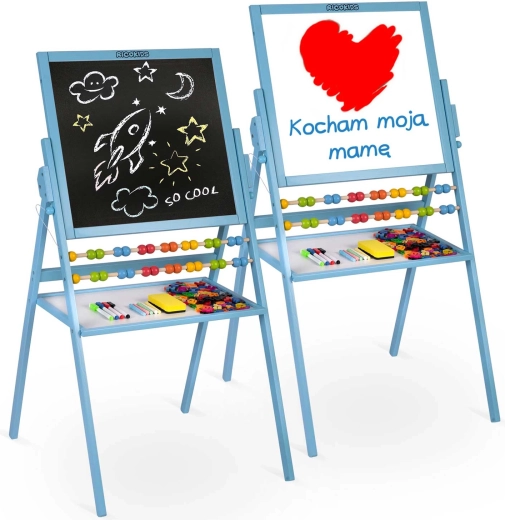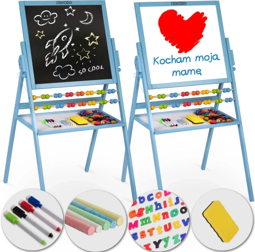 Duża, multifunkcyjna tablica dla dzieci marki RICOKIDS łączy kredową i magnetyczną białą stronę w jednej obrotowej ramie. Dzięki stabilnej drewnianej konstrukcji, zintegrowanemu liczydłu oraz bogatemu zestawowi akcesoriów (kredy, markery, gąbka, magnetyczne litery i cyfry) wspiera kreatywność, naukę i zabawę – wszystko bezpiecznie i z certyfikatami CE, EN 71.