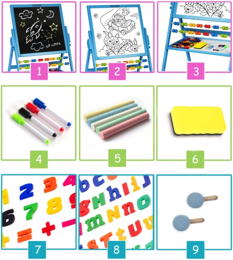 W zestawie znajduje się kolorowe liczydło, które w atrakcyjny sposób rozwija logikę i pomaga w pierwszych zadaniach rachunkowych. Bogaty komplet akcesoriów – markery, kredy, gąbka, magnetyczne litery i cyfry – umożliwia natychmiastową zabawę i naukę bez dodatkowych zakupów.