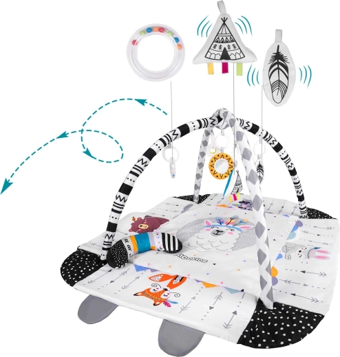Mata do zabawy RICOKIDS Boho 110 × 100 cm tworzy przytulne i bezpieczne gniazdko do codziennego odkrywania. Dwa skrzyżowane pałąki z odpinanymi zawieszkami (grzechotki, gryzaki, lusterko) wspierają śledzenie wzrokowe, koordynację oko–ręka i motorykę małą. Miękkie wypełnienie i podnoszone boki zapewniają komfort i ochronę podczas zabawy, a kontrastowe oraz zwierzęce motywy dostarczają stymulacji wzrokowej.