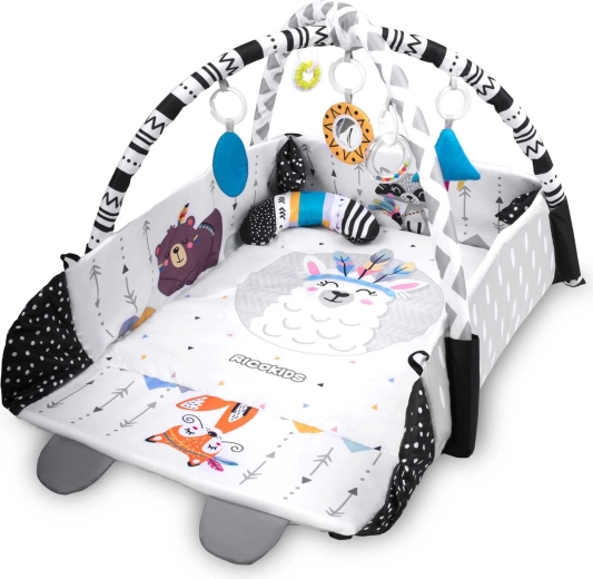 - 3w1 elastyczne użycie – otwarta mata, przytulne gniazdko z podniesionymi bokami lub centrum zabawy z pałąkami.