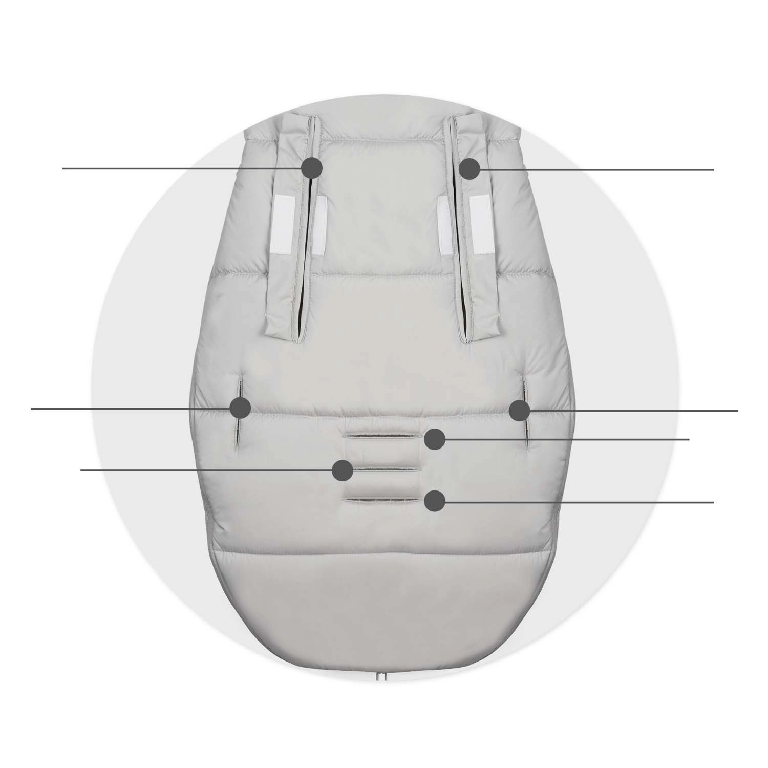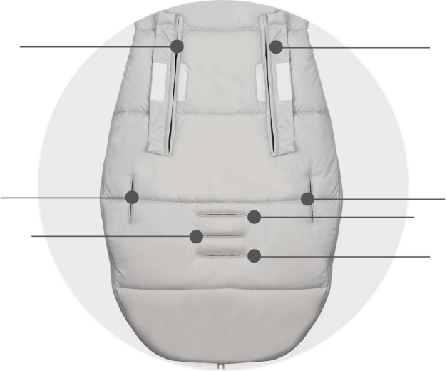 Kompatybilny z 2/3/5‑punktowymi pasami i wyposażony w element zapobiegający zsuwaniu. Łatwo pasuje do większości wózków i pozostaje stabilny także podczas jazdy.