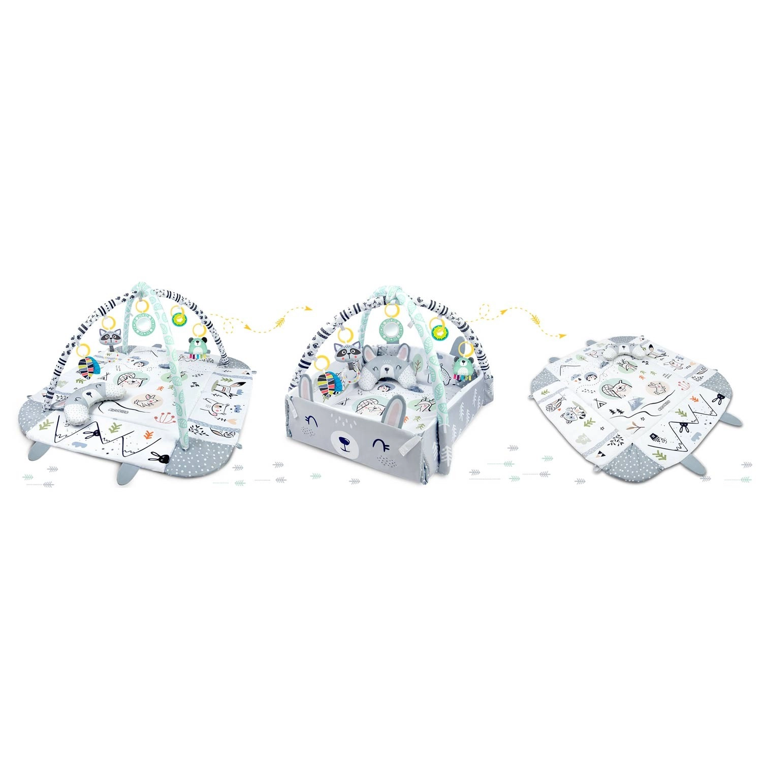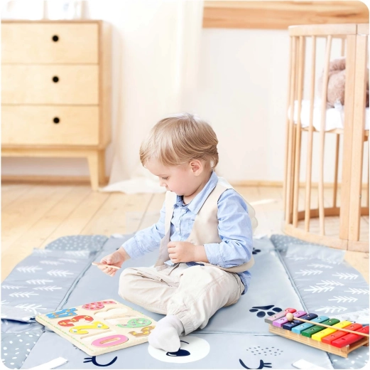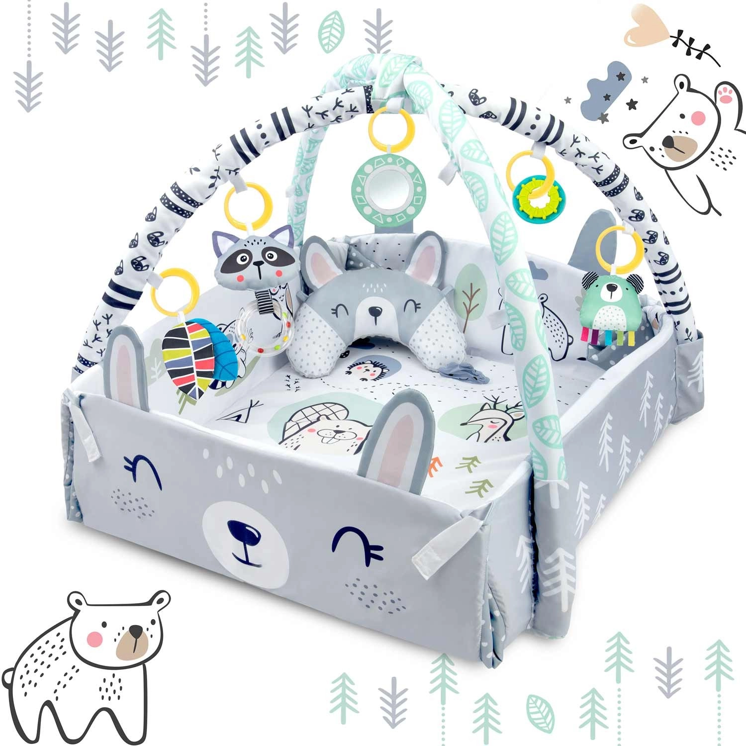 W zestawie znajduje się 7 oryginalnych zabawek, w tym lusterko, grzechotki, elementy szeleszczące i piszczące oraz zabawka z wstążkami sensorycznymi. Zabawki i wyściełane pałąki można łatwo przemieszczać lub zdejmować. Poduszka do tummy time z miękką stroną minky wspiera prawidłowe ułożenie i wzmacnianie mięśni szyi oraz pleców.