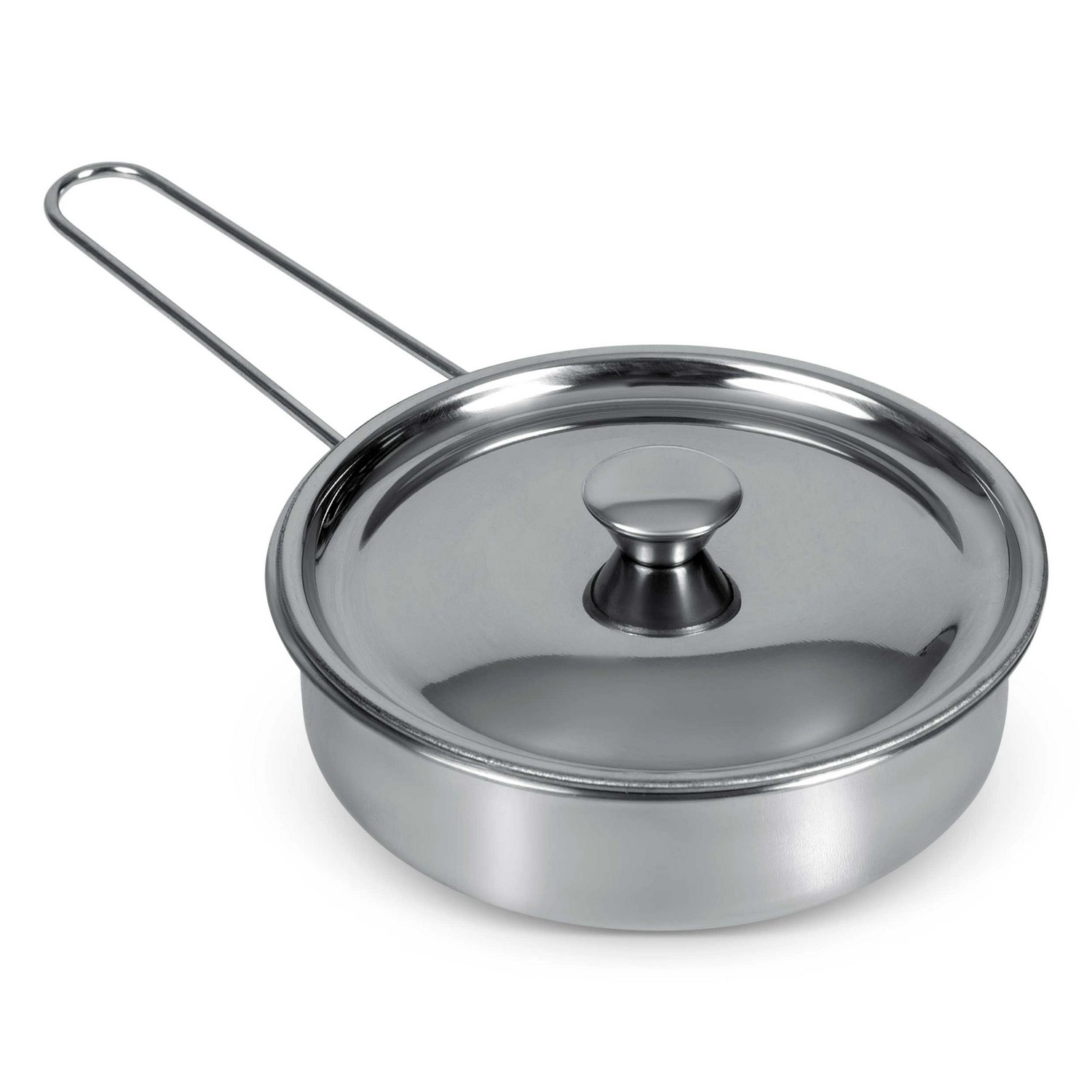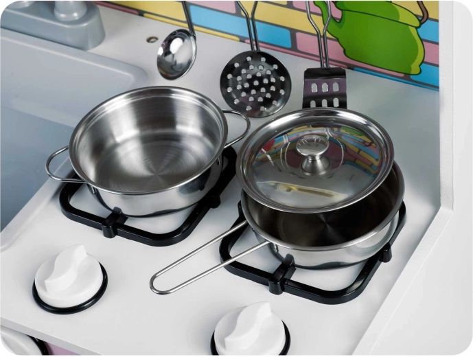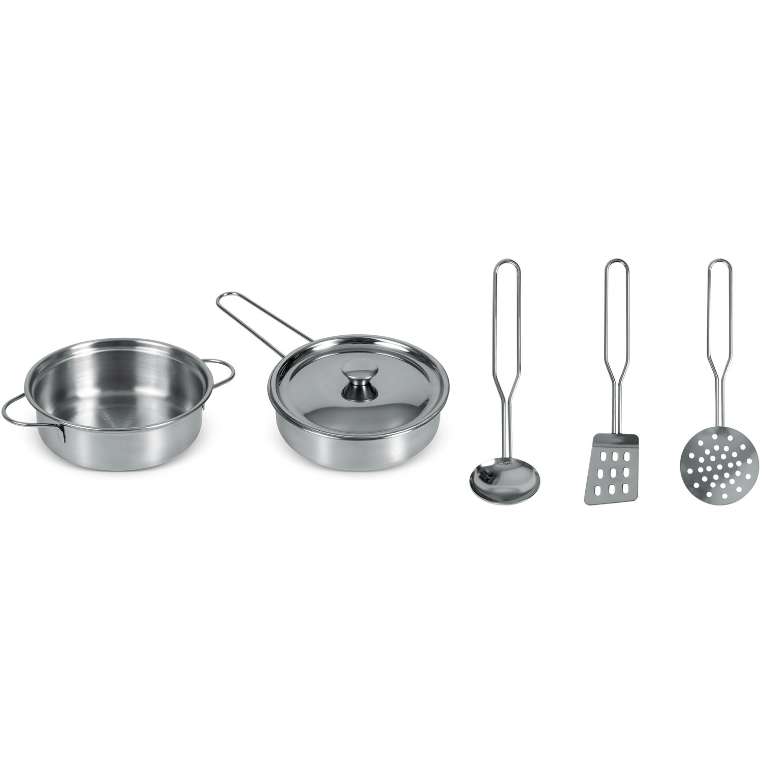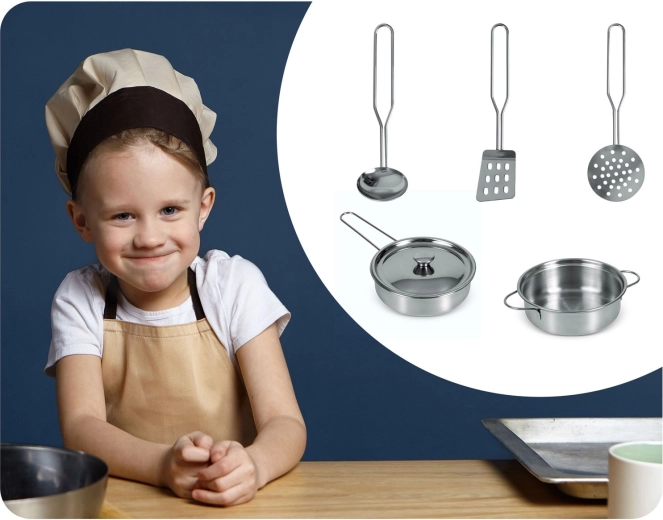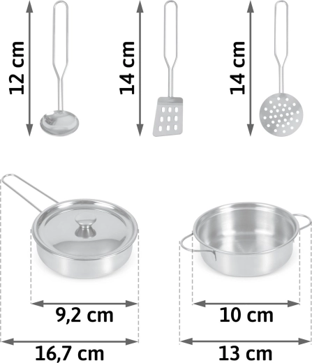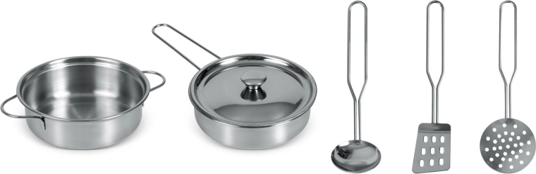 Garnek, rondel z pokrywką i trzy przydatne narzędzia w dziecięcym rozmiarze – wszystko z wytrzymałej stali nierdzewnej z lśniącą powierzchnią dla autentycznej zabawy w gotowanie.