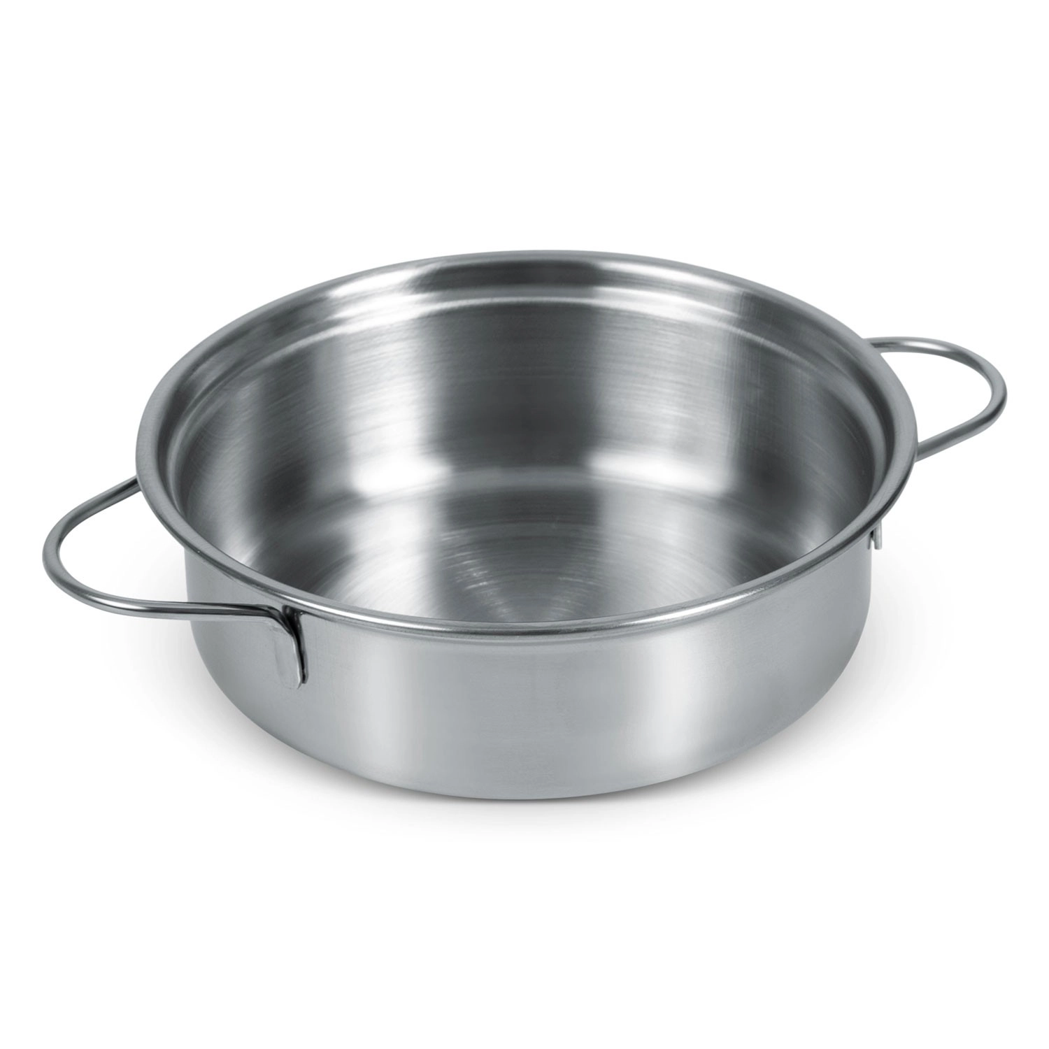 Szeroki garnek ze stali nierdzewnej z bocznymi uchwytami jest idealny do „gotowania zupy”, mieszania i łatwo leży nawet w małych dłoniach.