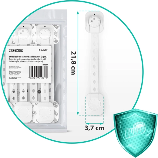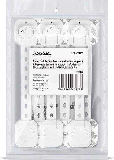 Chroń swój dom przed ciekawskimi rączkami dzięki praktycznemu zestawowi 6 sztuk zamków zabezpieczających RICOKIDS. Dzięki mocnemu klejowi 3M, regulowanej długości paska oraz łatwemu montażowi bez narzędzi szybko zabezpieczysz szafki, szuflady i urządzenia. Zamki są wytrzymałe, nie uszkadzają mebli, pracują cicho i są odporne na UV, więc nie blakną.