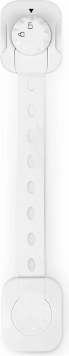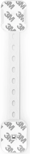 Elastyczny pasek z wieloma otworami umożliwia precyzyjne dopasowanie długości i bezpieczne zablokowanie szafek, szuflad oraz urządzeń o różnych wymiarach.