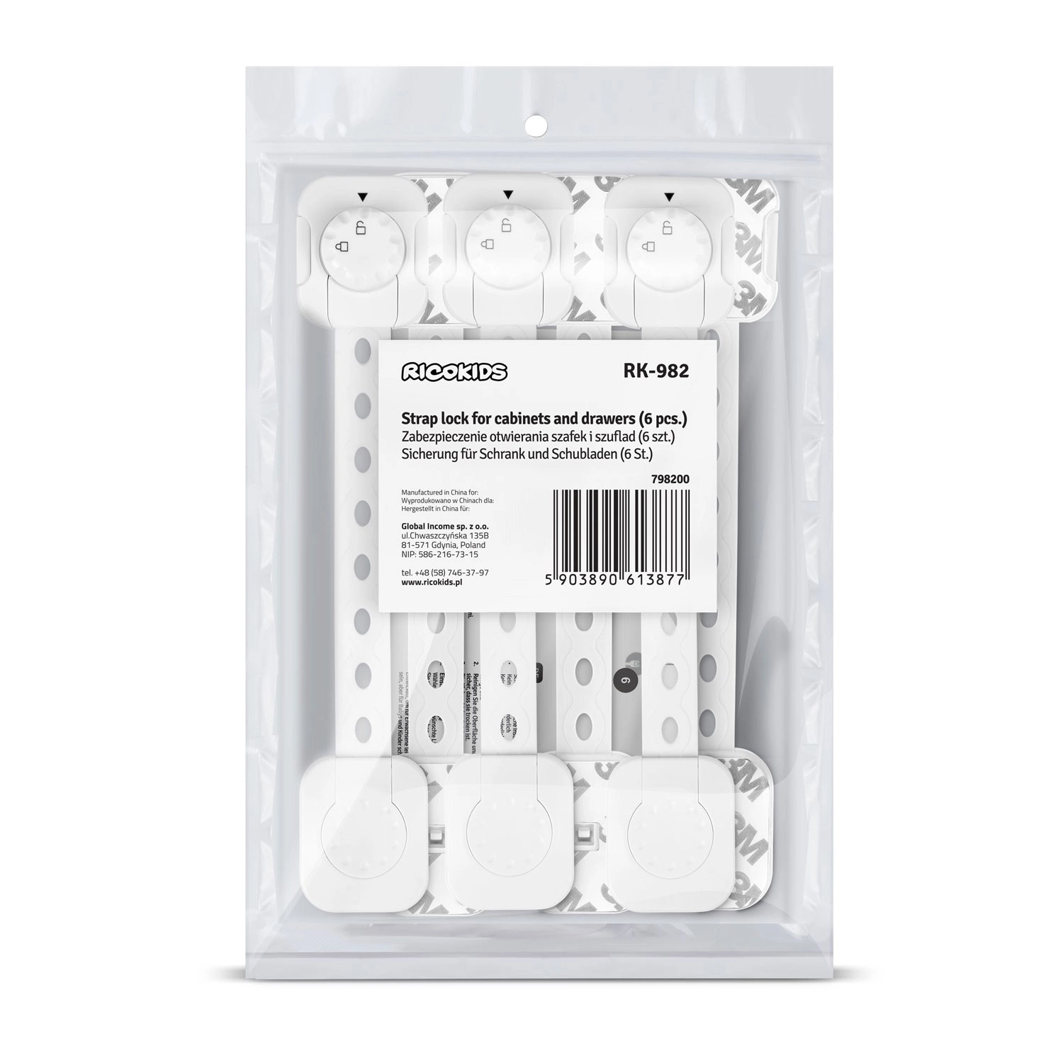Zamki zabezpieczające RICOKIDS pomagają utrzymać dzieci w bezpieczeństwie, a meble w nienaruszonym stanie. Dyskretna biała kolorystyka i czysty design współgrają z większością wnętrz, a wytrzymała plastikowa obudowa z elastycznym paskiem skutecznie zapobiega niechcianemu otwieraniu szafek, szuflad, lodówki czy klapy WC. Docenisz szybki montaż bez wiercenia oraz możliwość łatwego demontażu bez uszkadzania powierzchni.