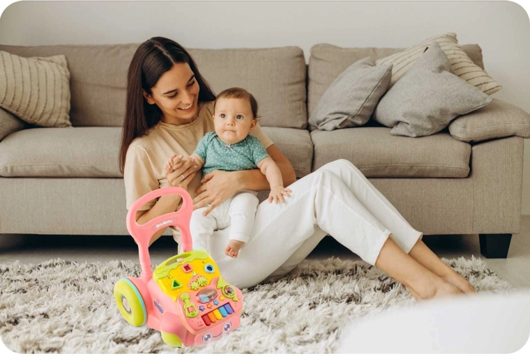 Duże koła z gumową powierzchnią nie ślizgają się i nie rysują podłogi. Zintegrowany spowalniacz pomaga dziecku iść pewniejszym tempem.