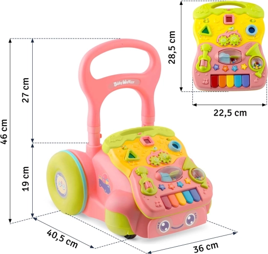Stabilny pchacz wspiera pierwsze kroki, a odłączany panel oferuje światła, dźwięki i gry rozwijające motorykę i zmysły – w domu i w podróży.