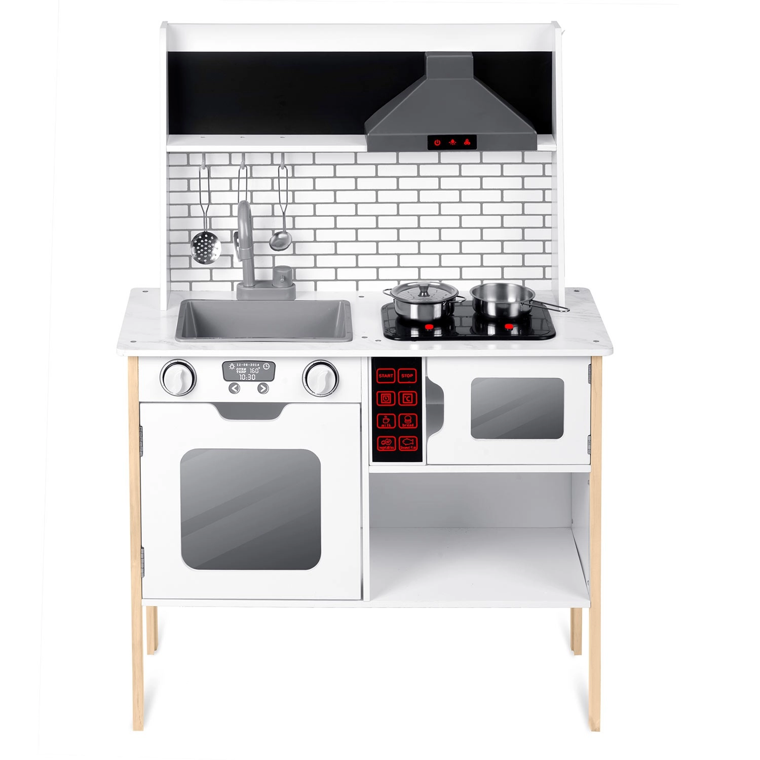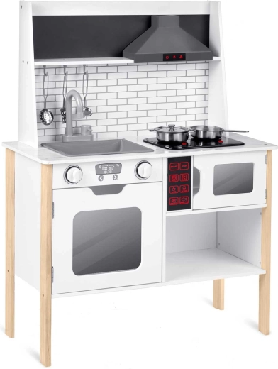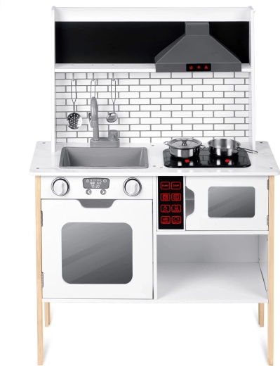 Kuchnia dla dzieci RICOKIDS RC-846 to przemyślany drewniany zestaw, który zamienia pokój dziecka w małą restaurację. LED-owe oświetlenie okapu i mikrofalówki, podświetlane i dźwiękowe palniki oraz panel sterowania z efektami tworzą autentyczne wrażenia z gotowania. Minimalistyczna, stabilna konstrukcja świetnie pasuje do nowoczesnych wnętrz, a dzięki wysokiej jakości materiałom posłuży przez lata zabawy.