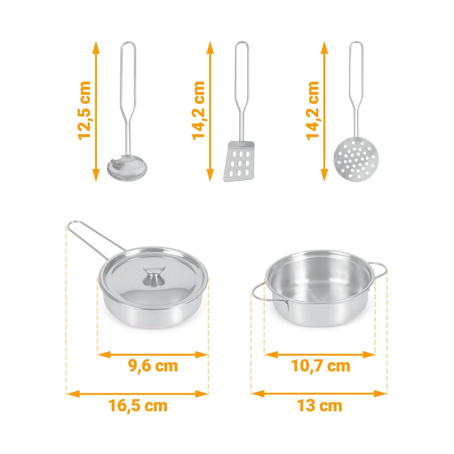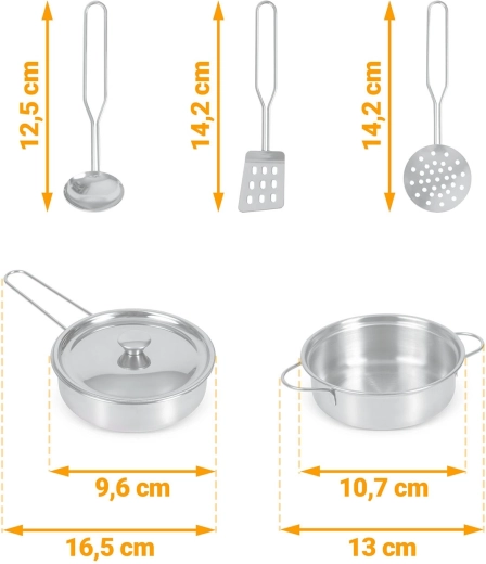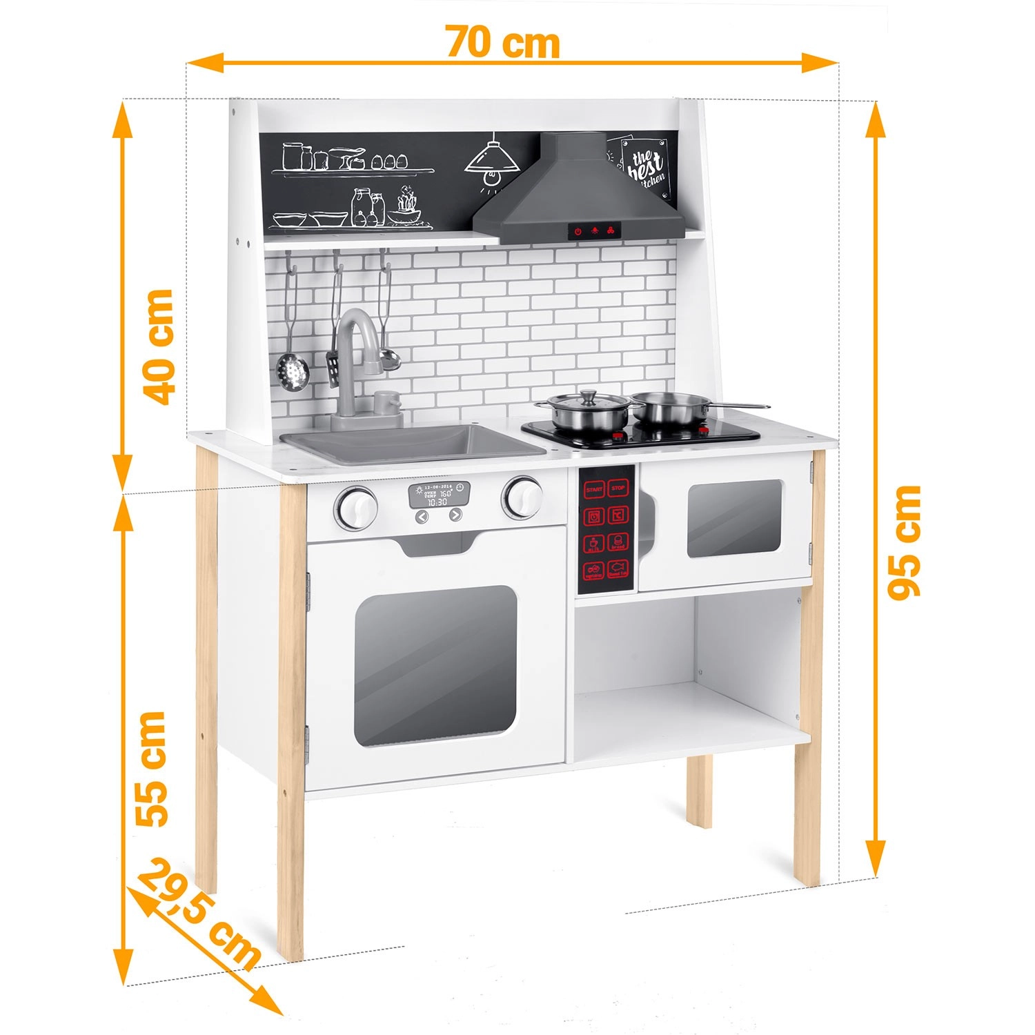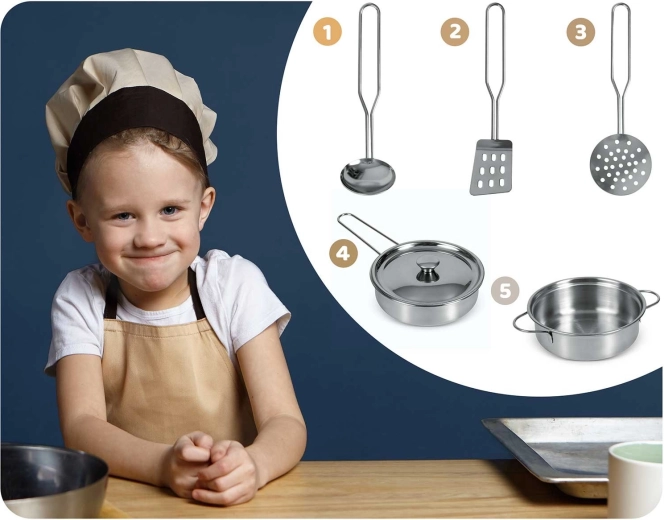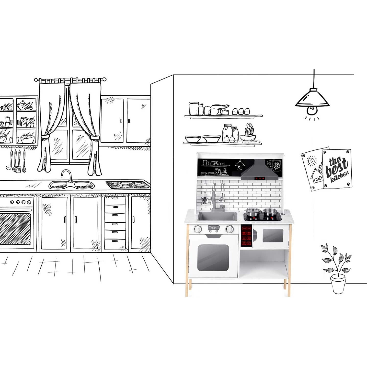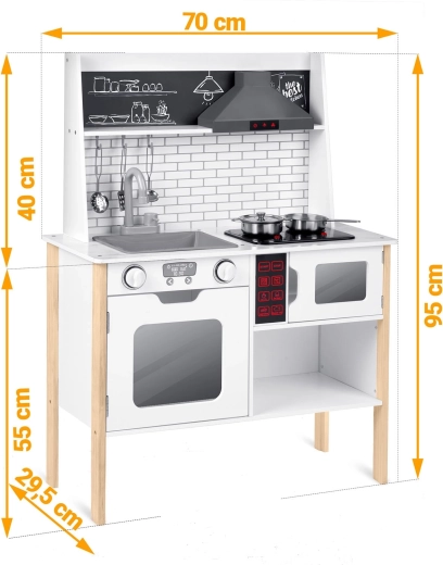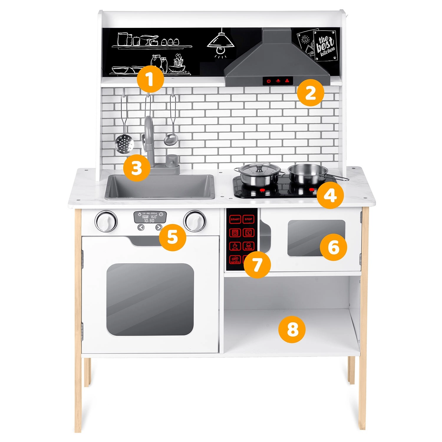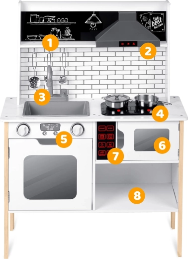 W zestawie znajduje się bogate wyposażenie: rondel, garnek, cedzak, chochla, łopatka i pokrywka. Dzieci mogą pisać kredą menu na powierzchni tablicowej, ćwiczyć współpracę i kompetencje społeczne oraz bezpiecznie naśladować czynności dorosłych – od mycia naczyń po pieczenie w piekarniku.