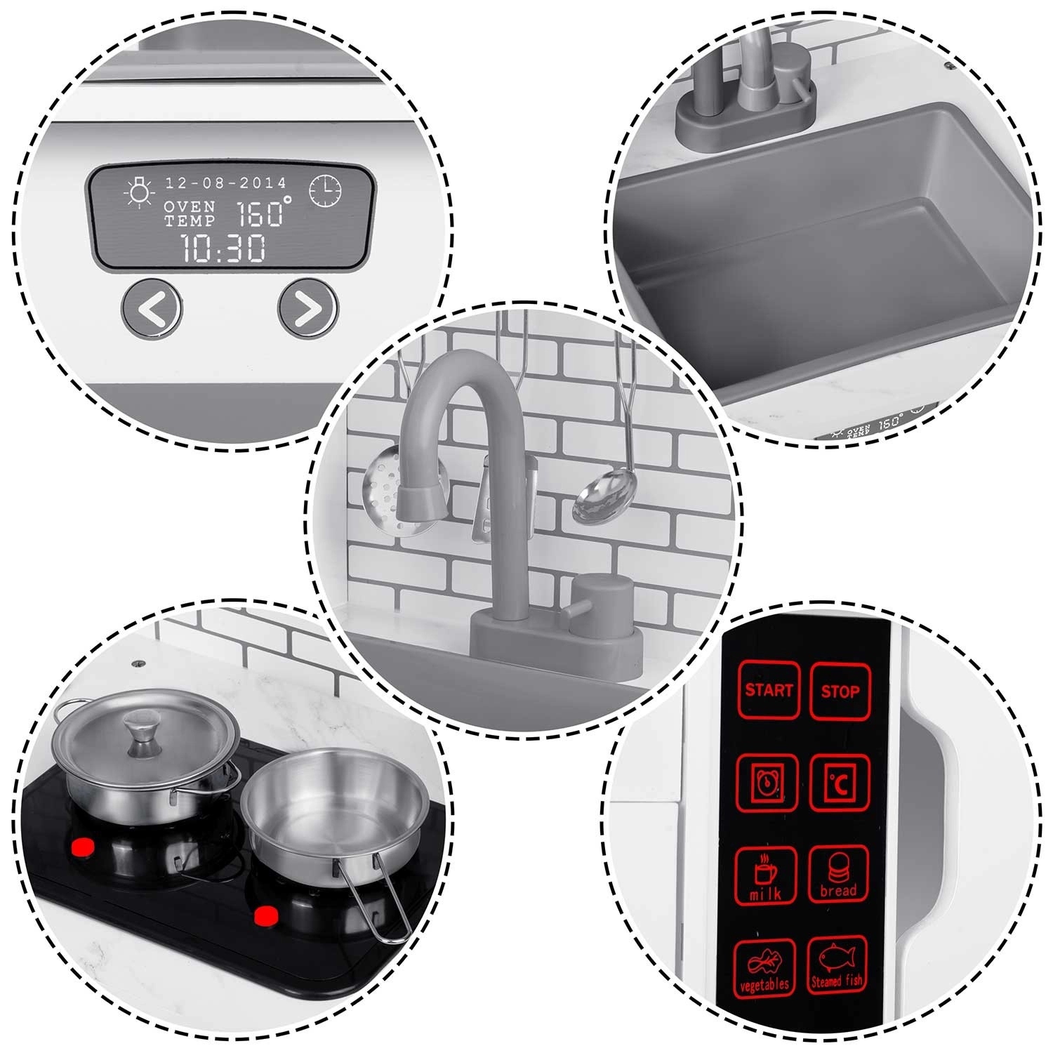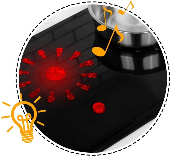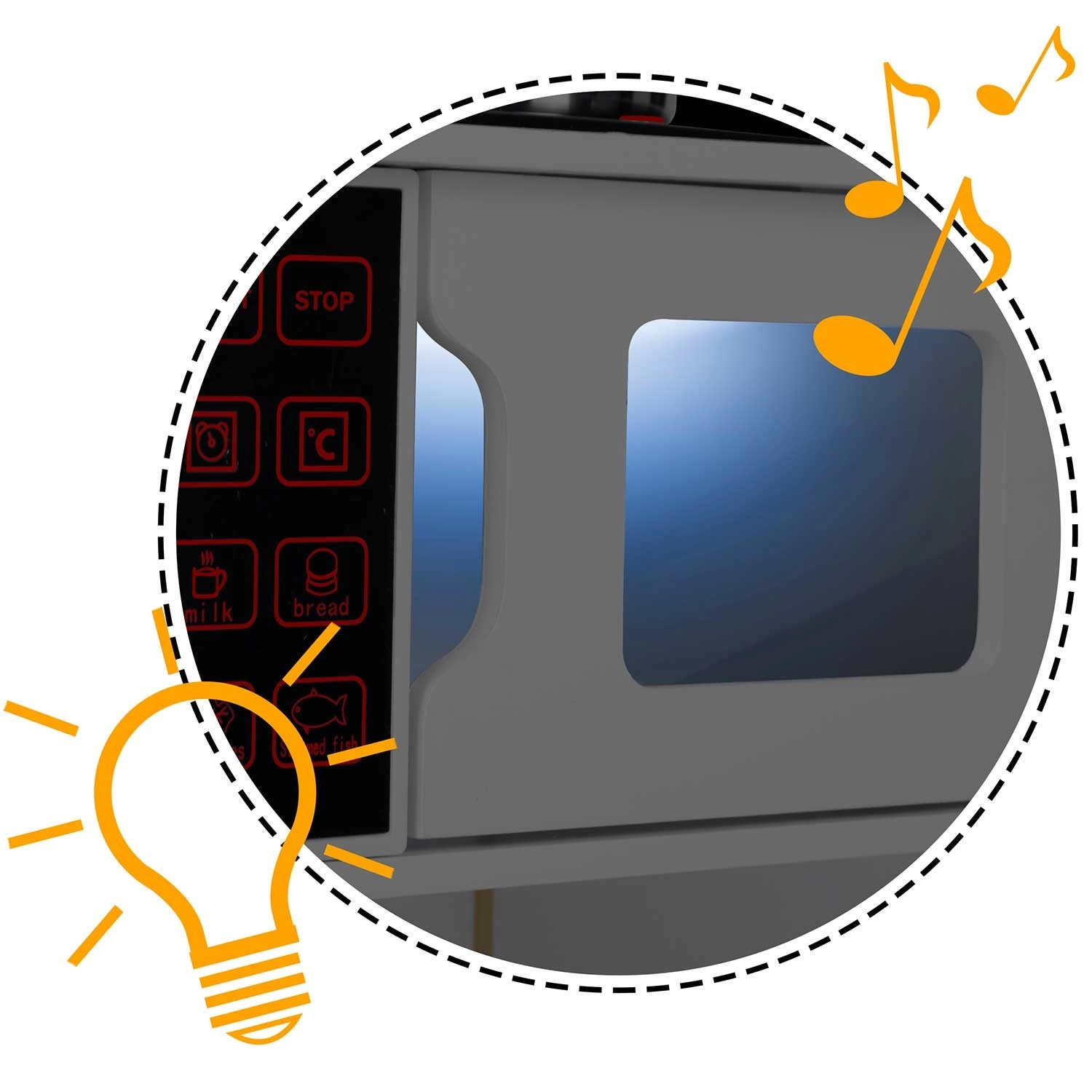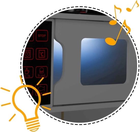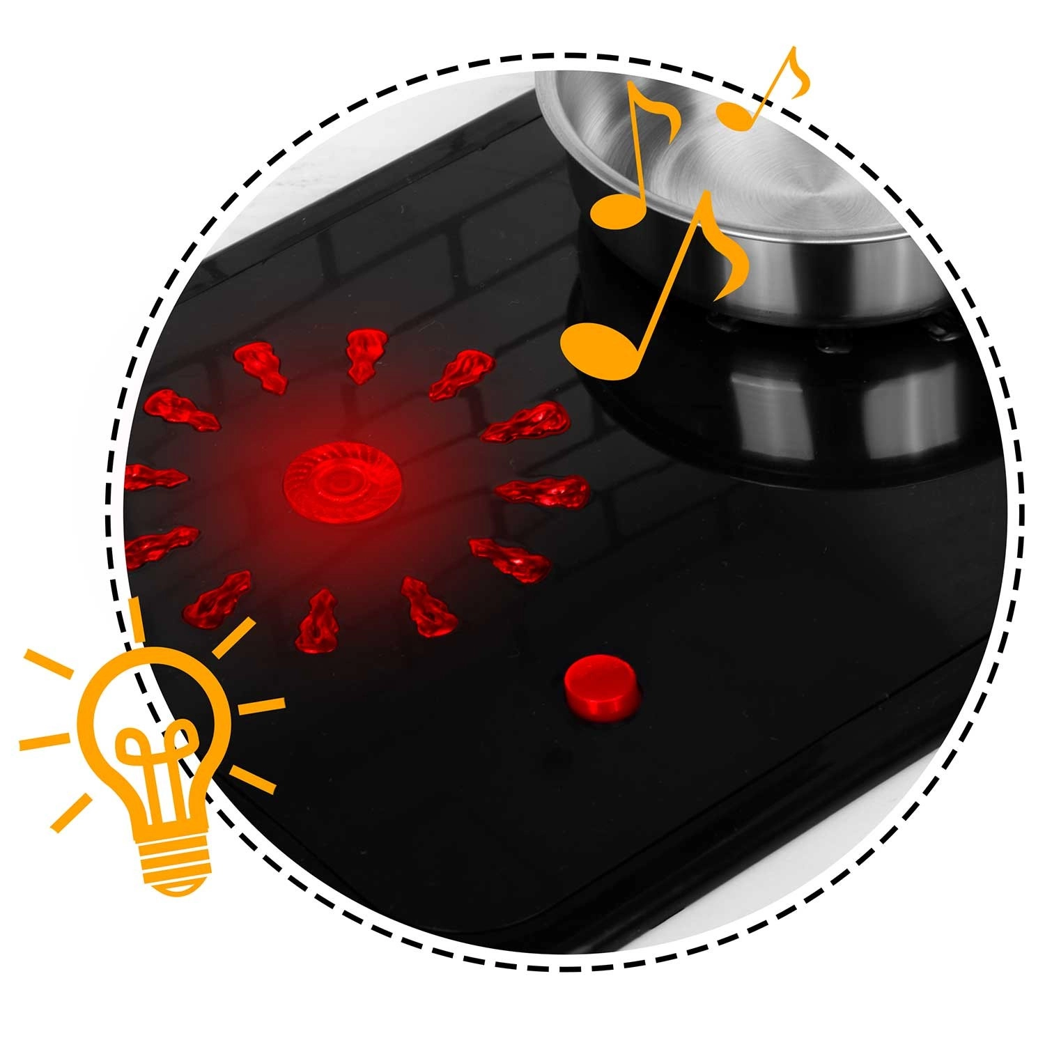 Po naciśnięciu przycisku palniki się podświetlają i wydają delikatne dźwięki gotowania, takie jak bulgotanie wody – zabawna i bezpieczna imitacja prawdziwej kuchni.