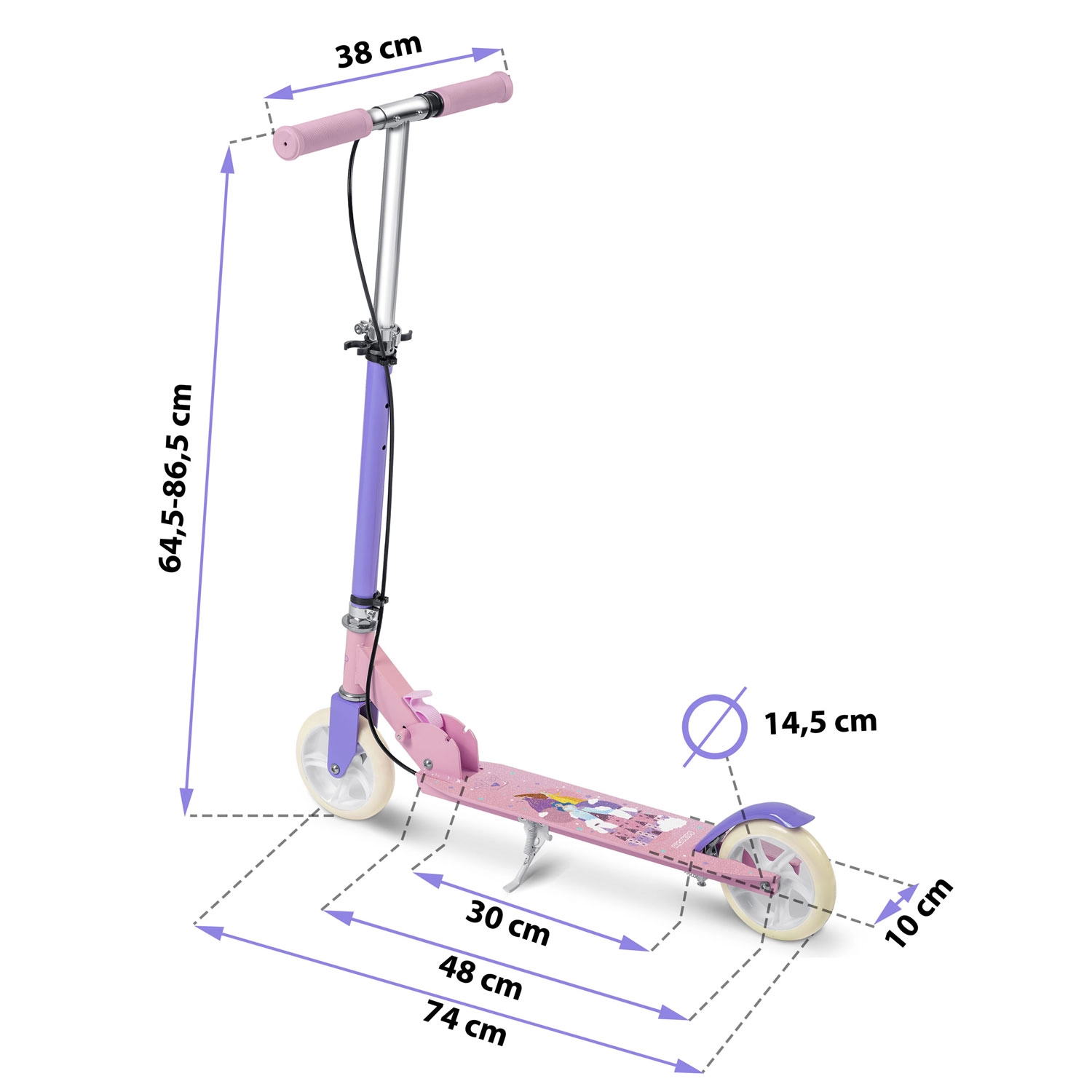 Praktyczny mechanizm składania ułatwia przenoszenie i przechowywanie. Regulowana wysokość kierownicy rośnie wraz z dzieckiem, a stopka umożliwia łatwe parkowanie w dowolnym miejscu.