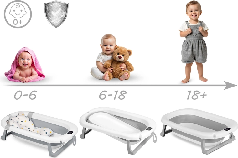 Wanienka została zaprojektowana tak, aby dopasowywała się do rozwoju dziecka: z wkładką 0–6 miesięcy do bezpiecznego leżenia, 6–18 miesięcy do pierwszych samodzielnych siadów bez wkładki oraz od 18 miesięcy dla większej przestrzeni do zabawy. Spełnia europejskie normy bezpieczeństwa, nie zawiera BPA i oferuje długą żywotność oraz wielofunkcyjne zastosowanie w domu.