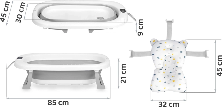 Składana konstrukcja z rozkładanymi stabilnymi nogami i antypoślizgowymi stopkami zapewnia pewność nawet na śliskiej podłodze. Dzięki kompaktowym wymiarom po złożeniu wanienkę łatwo przechowasz lub zabierzesz w podróż. Praktyczny uchwyt na słuchawkę prysznicową ułatwia napełnianie bez chlapania, a dno z odpływem przyspiesza opróżnianie.
