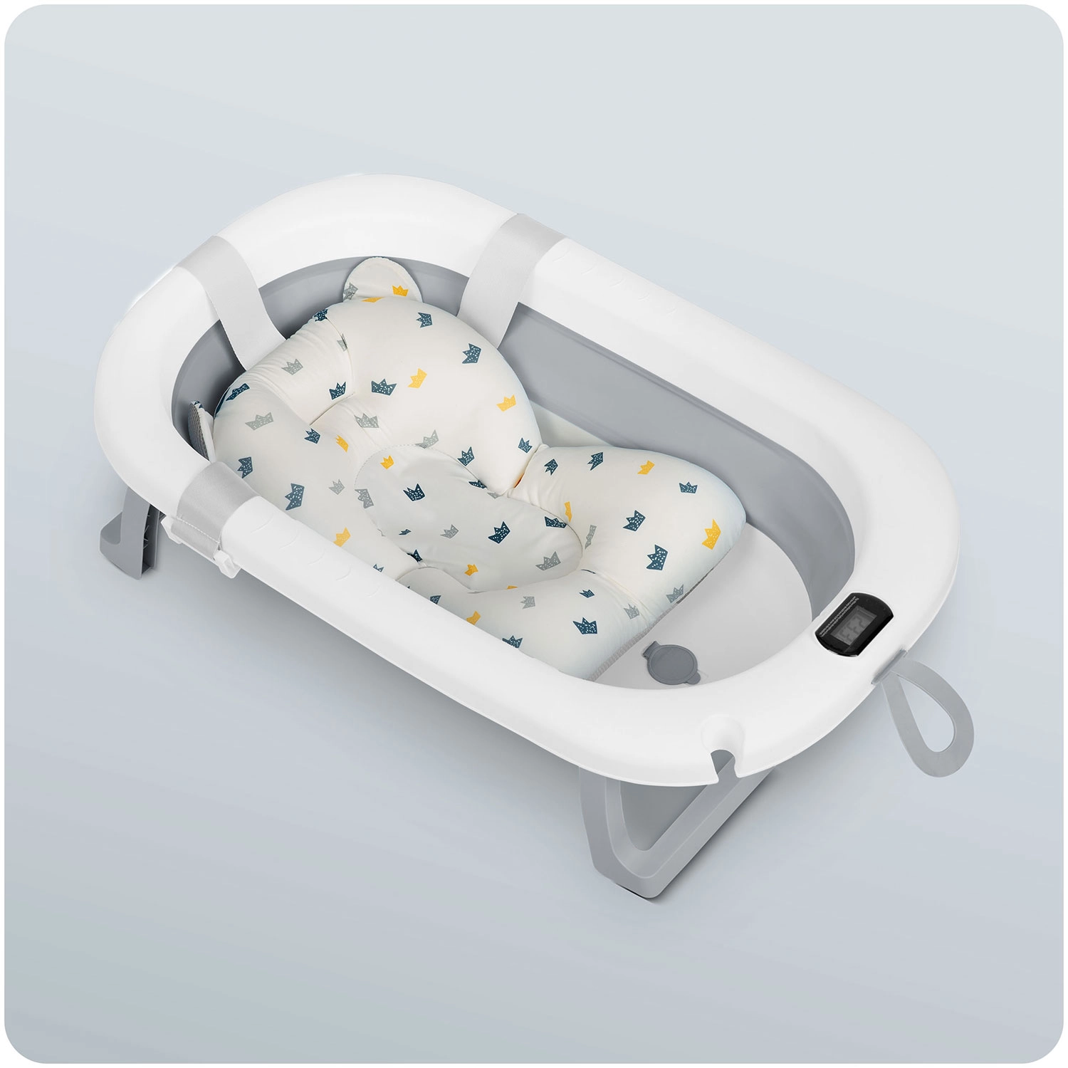 Wyściełana, szybkoschnąca wkładka z regulowanymi paskami stabilnie trzyma się krawędzi wanienki. Podpiera główkę i plecy, zwiększając komfort i bezpieczeństwo.