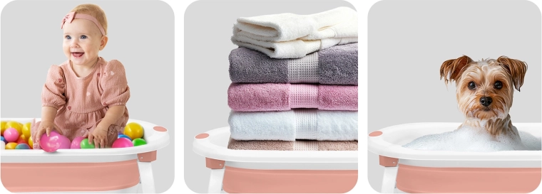 Praktyczne detale docenisz na co dzień: uchwyt na słuchawkę prysznicową dla łatwego napełniania bez rozpryskiwania, stabilne, rozkładane nogi z antypoślizgiem oraz szybkie opróżnianie dzięki korkowi. Wanienka wykonana jest z wysokiej jakości materiałów bez BPA, co gwarantuje bezpieczeństwo i łatwe czyszczenie.